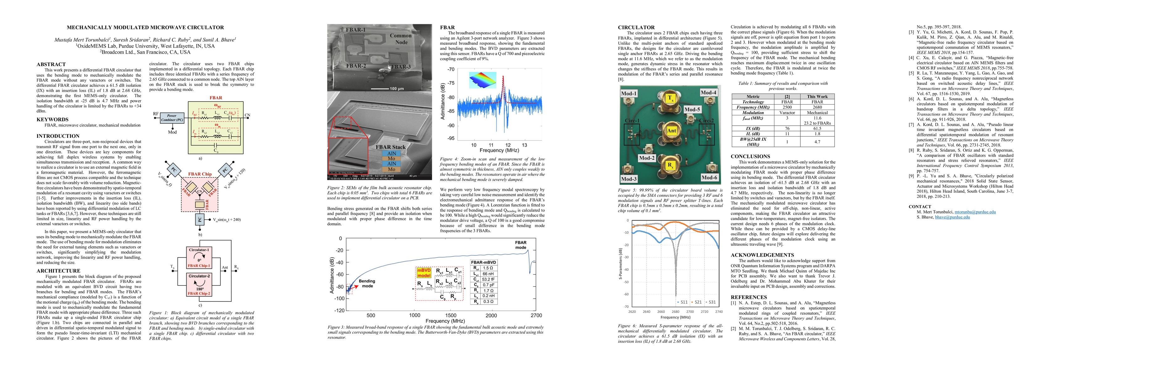 This paper introduces a MEMS-only mechanically modulated microwave circulator using a differential FBAR that achieves 61.5 dB isolation and 1.8 dB insertion loss at 2.68 GHz, marking the first of its kind without varactors or switches. The device has a 4.7 MHz isolation bandwidth at -25 dB and can handle +34 dBm of power.