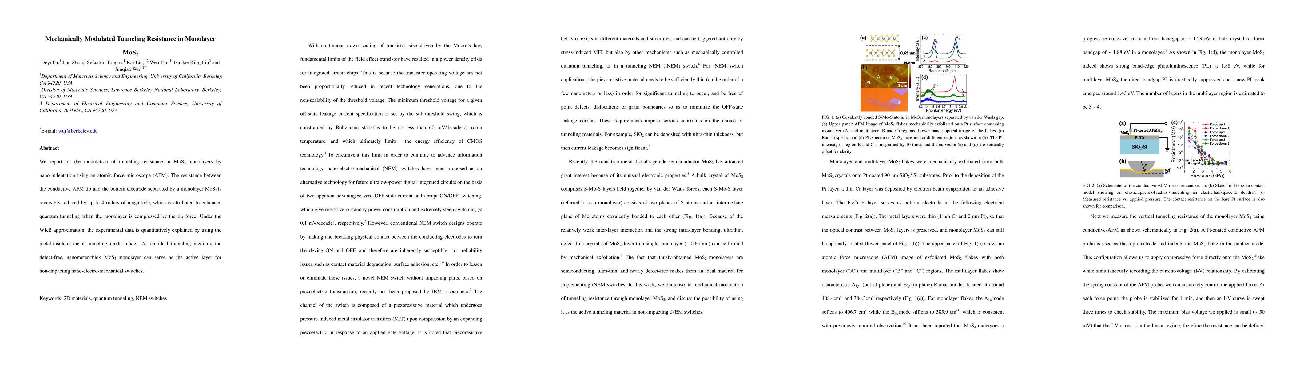 Researchers discovered that applying nano-indentation to a monolayer of MoS2 using an AFM tip reversibly reduces its tunneling resistance by up to 4 orders of magnitude, making it suitable for non-impacting nano-electro-mechanical switches.