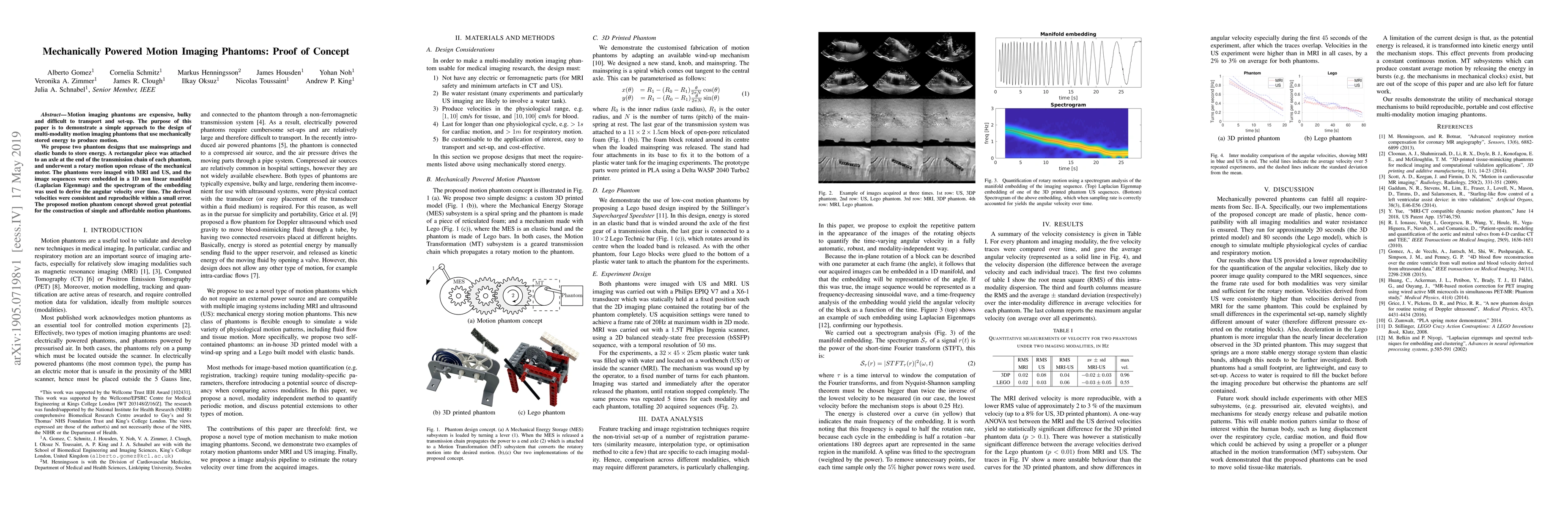 Motion imaging phantoms are expensive, bulky and difficult to transport and set-up. The purpose of this paper is to demonstrate a simple approach to the design of multi-modality motion imaging phantoms that use mechanically stored energy to produce motion. We propose two phantom designs that use mainsprings and elastic bands to store energy. A rectangular piece was attached to an axle at the end of the transmission chain of each phantom, and underwent a rotary motion upon release of the mechanical motor. The phantoms were imaged with MRI and US, and the image sequences were embedded in a 1D non linear manifold (Laplacian Eigenmap) and the spectrogram of the embedding was used to derive the angular velocity over time. The derived velocities were consistent and reproducible within a small error. The proposed motion phantom concept showed great potential for the construction of simple and affordable motion phantoms