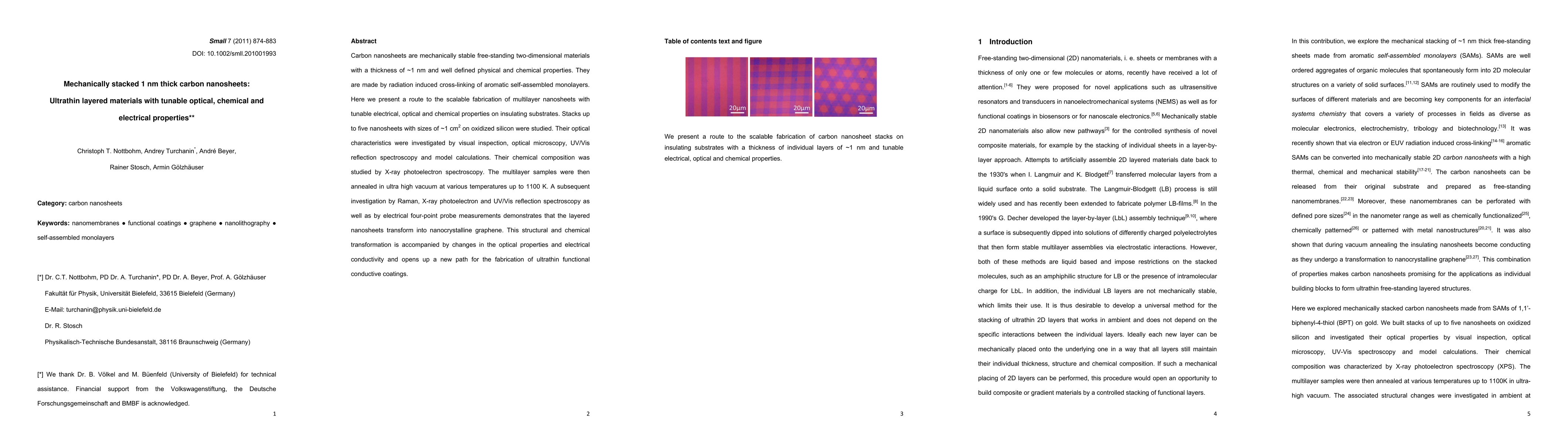 This paper presents a scalable method for fabricating mechanically stacked 1 nm thick carbon nanosheets, demonstrating tunable electrical, optical, and chemical properties. The transformation into nanocrystalline graphene upon annealing enhances their conductivity and opens new avenues for ultrathin conductive coatings.