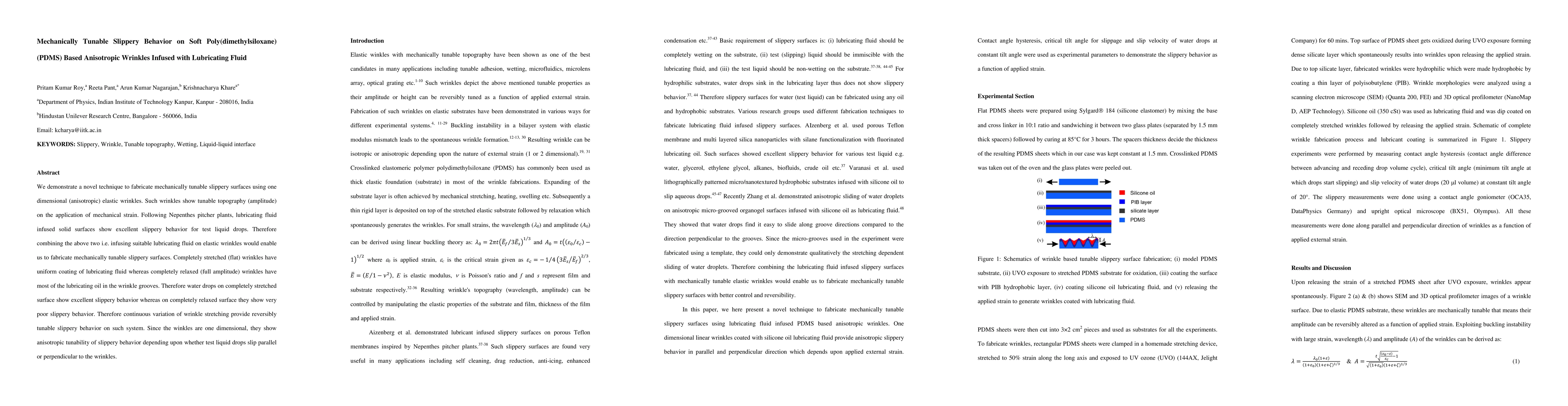This research develops mechanically tunable slippery surfaces by creating anisotropic wrinkles in PDMS infused with lubricating fluid, allowing reversible adjustment of slipperiness through mechanical strain. The tuning is anisotropic, with optimal slipperiness depending on the direction of liquid droplet movement relative to the wrinkles.