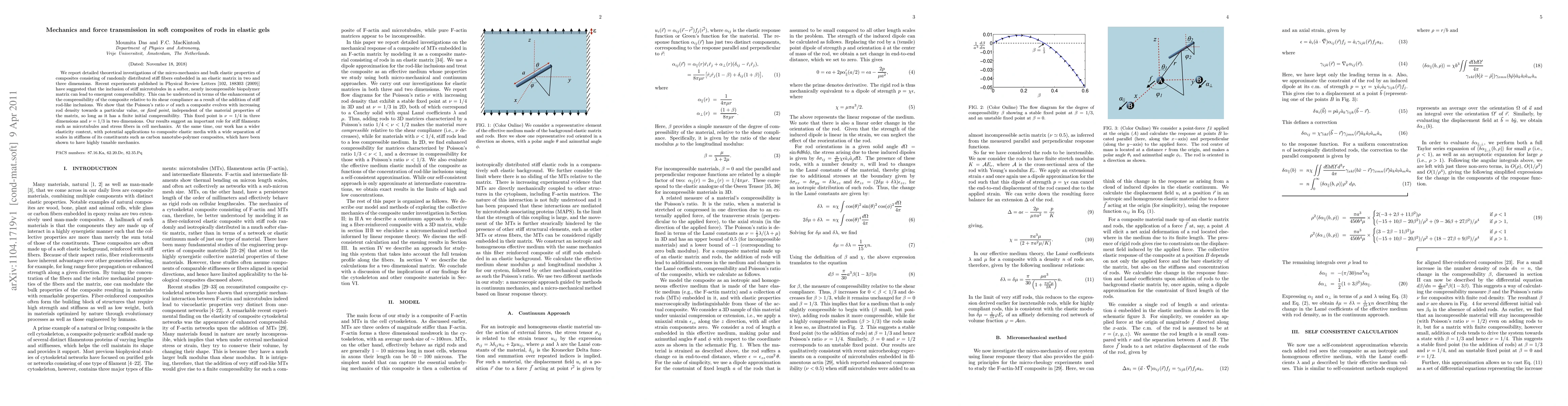 This paper investigates the mechanics and force transmission in composites of stiff rods embedded in elastic gels, revealing that such composites exhibit emergent compressibility. The study finds a fixed Poisson's ratio of 1/4 in three dimensions and 1/3 in two dimensions, suggesting significant implications for cell mechanics and tunable mechanical properties in materials like carbon nanotube-polymer composites.