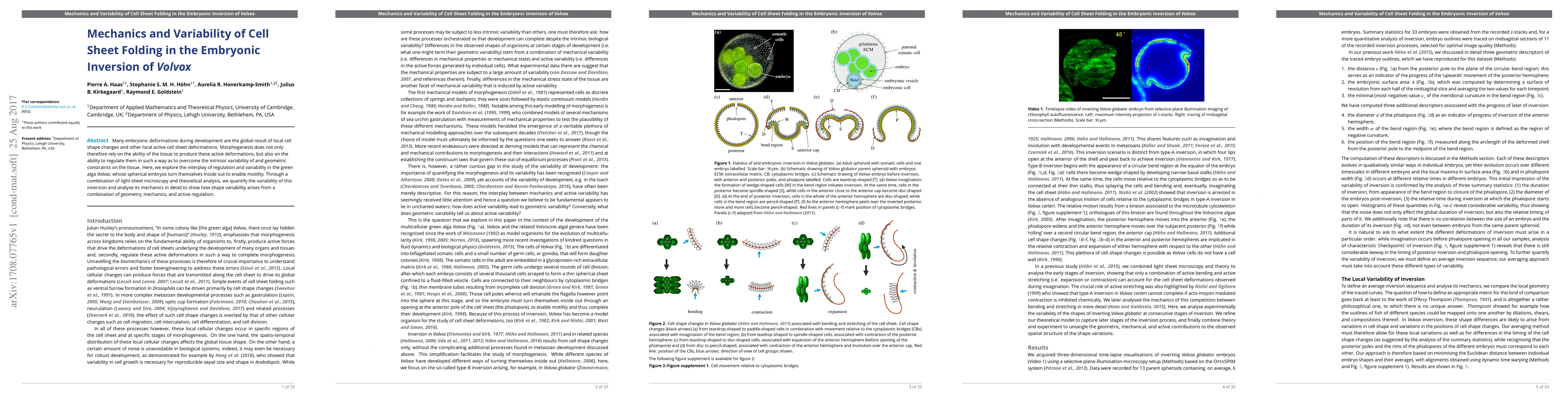 This paper investigates the mechanics and variability of cell sheet folding during the embryonic inversion of $Volvox$, a green alga. It combines light sheet microscopy and theoretical analysis to quantify the variability and mechanics of this process, revealing how shape variability emerges from geometry, mechanics, and active regulation.