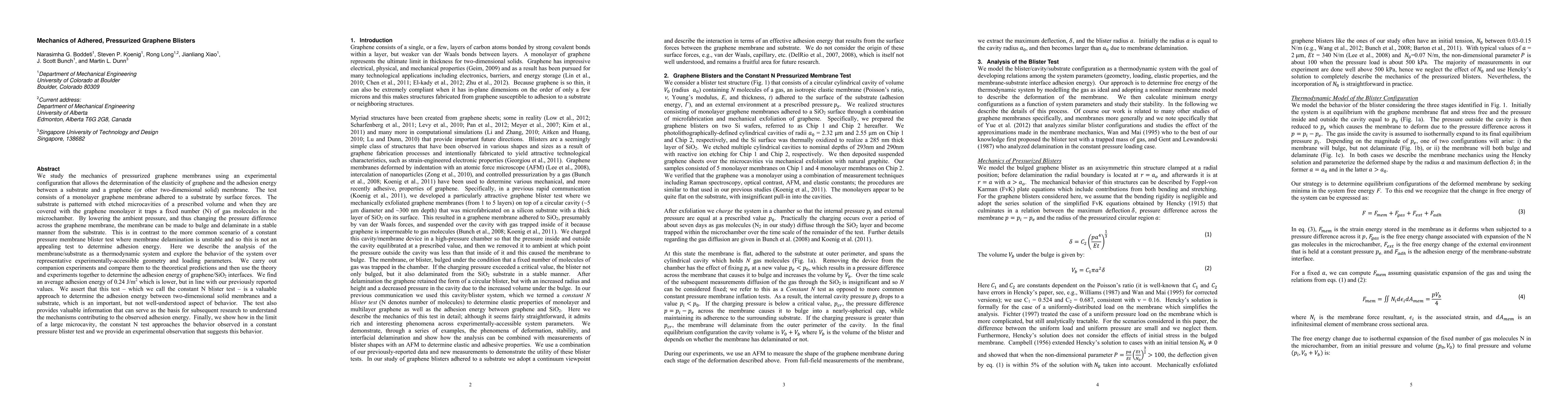 This paper investigates the mechanics of pressurized graphene blisters adhered to a substrate, determining the elasticity of graphene and the adhesion energy between graphene and SiO2. The constant N blister test reveals an average adhesion energy of 0.24 J/m², providing a valuable method for understanding the behavior of two-dimensional solid membranes.