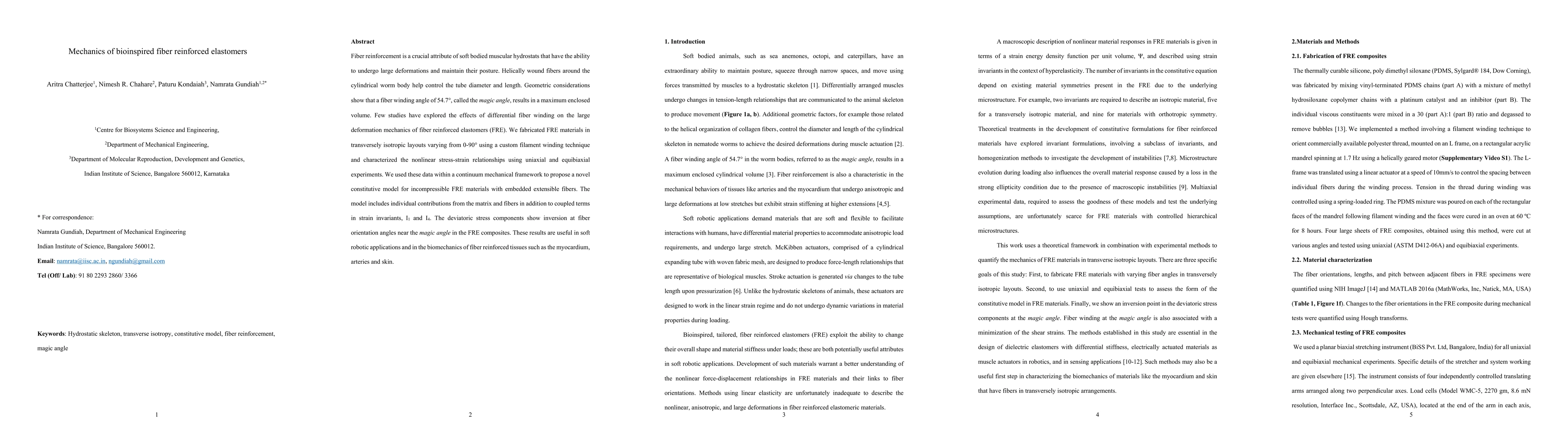 This paper investigates the mechanics of bioinspired fiber-reinforced elastomers (FRE) using a filament winding technique to create materials with varying fiber orientations. It proposes a novel constitutive model for FRE materials, highlighting the significance of the "magic angle" of 54.7 degrees for optimal reinforcement, and demonstrates its implications for soft robotics and biomechanics.
