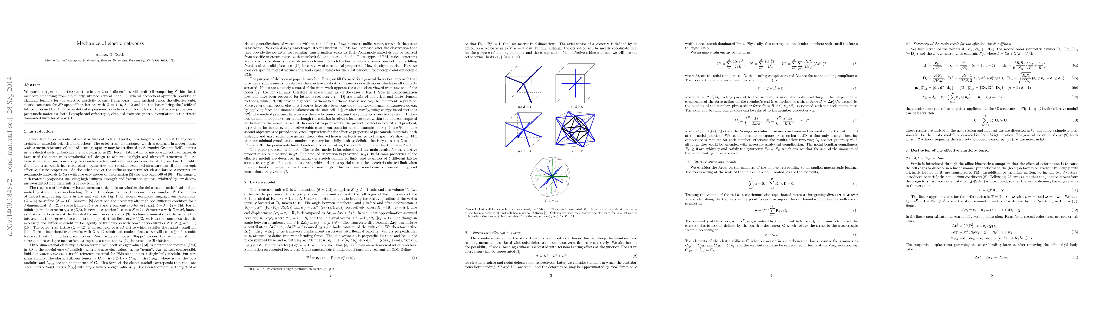 We consider a periodic lattice structure in $d=2$ or $3$ dimensions with unit cell comprising $Z$ thin elastic members emanating from a similarly situated central node. A general theoretical approach provides an algebraic formula for the effective elasticity of such frameworks. The method yields the effective cubic elastic constants for 3D space-filling lattices with $Z=4$, $6$, $8$, $12$ and $14$, the latter being the "stiffest" lattice proposed by Gurtner and Durand (2014). The analytical expressions provide explicit formulas for the effective properties of pentamode materials, both isotropic and anisotropic, obtained from the general formulation in the stretch dominated limit for $Z=d+1$.