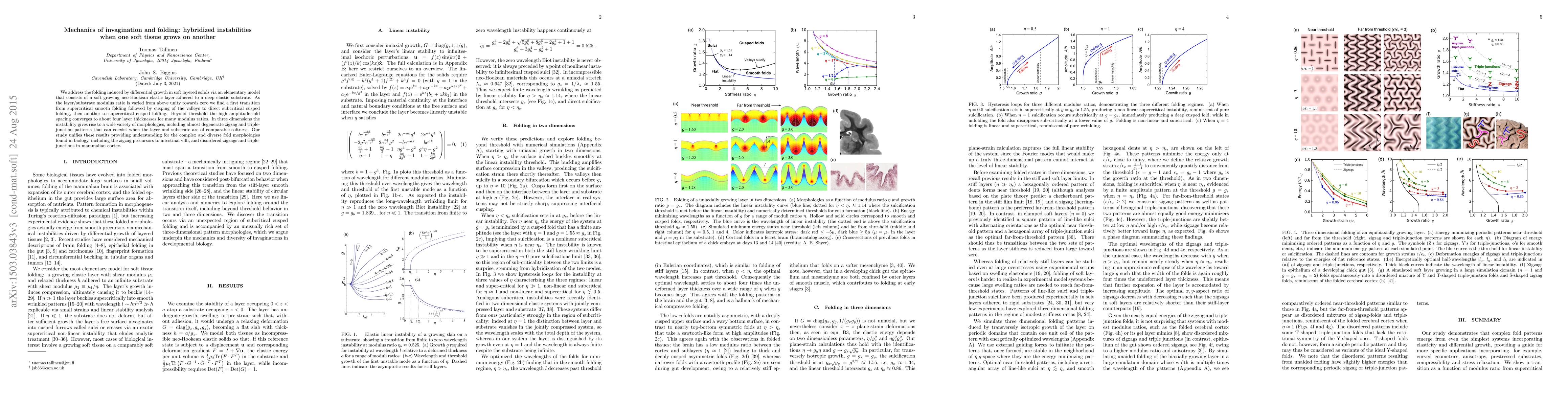 This research presents a model of soft tissue growth on another, showing transitions from smooth to cusped folding as layer/substrate stiffness ratio changes. In 3D, it generates diverse morphologies like zigzags and triple-junctions, relevant to biological structures like intestinal villi and brain cortex.