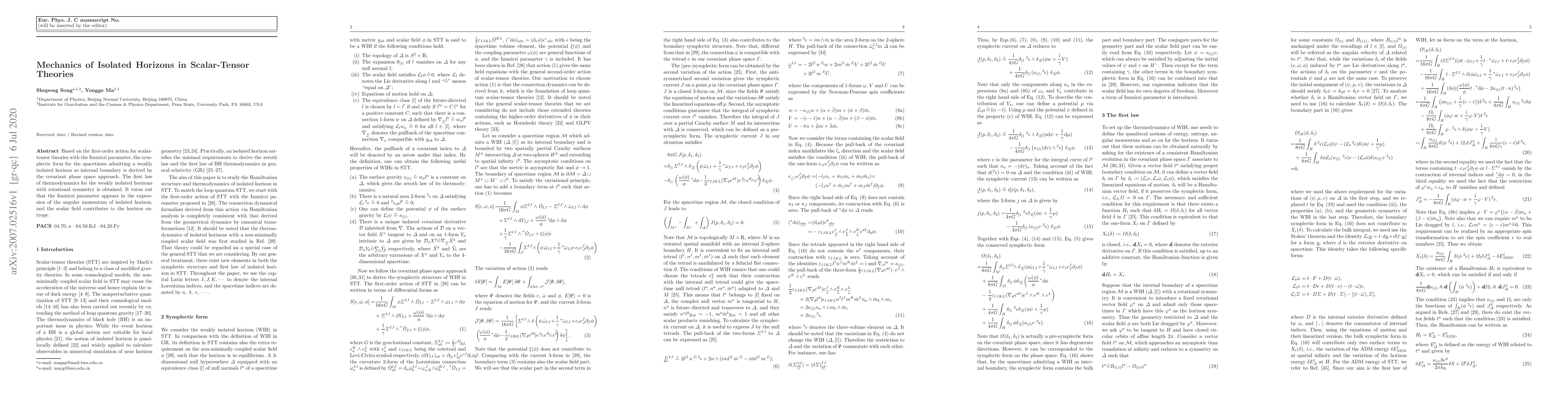This paper derives the symplectic form for scalar-tensor theories using the covariant phase space approach, focusing on spacetimes with weakly isolated horizons. It establishes the first law of thermodynamics for these horizons, revealing that the Immirzi parameter influences the angular momentum and the scalar field affects the horizon entropy.