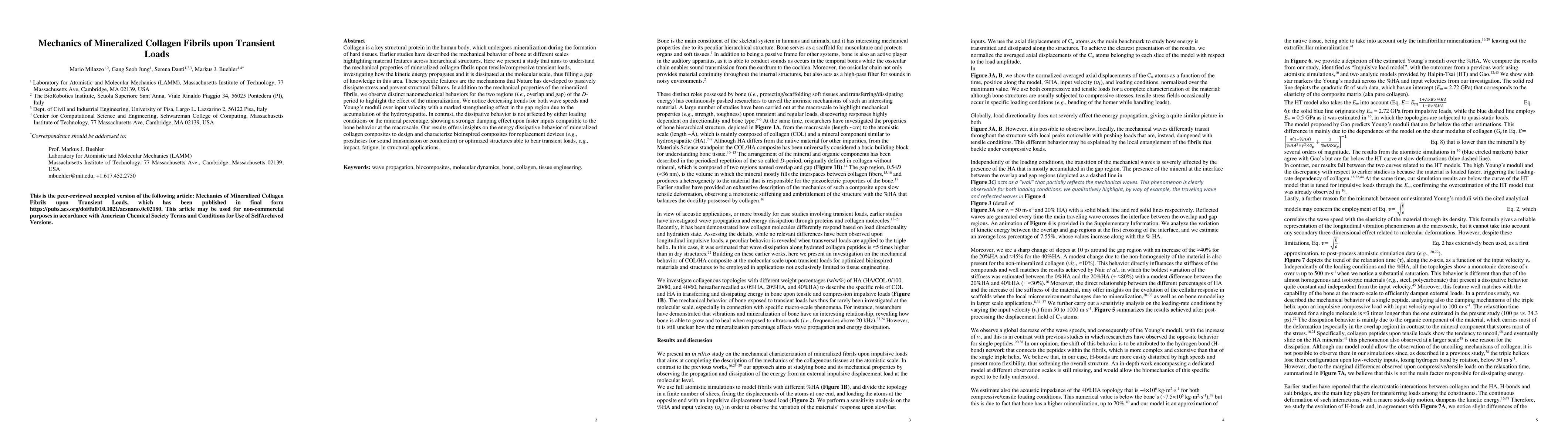 Collagen is a key structural protein in the human body, which undergoes mineralization during the formation of hard tissues. Earlier studies have described the mechanical behavior of bone at different scales highlighting material features across hierarchical structures. Here we present a study that aims to understand the mechanical properties of mineralized collagen fibrils upon tensile/compressive transient loads, investigating how the kinetic energy propagates and it is dissipated at the molecular scale, thus filling a gap of knowledge in this area. These specific features are the mechanisms that Nature has developed to passively dissipate stress and prevent structural failures. In addition to the mechanical properties of the mineralized fibrils, we observe distinct nanomechanical behaviors for the two regions (i.e., overlap and gap) of the D-period to highlight the effect of the mineralization. We notice decreasing trends for both wave speeds and Young s moduli over input velocity with a marked strengthening effect in the gap region due to the accumulation of the hydroxyapatite. In contrast, the dissipative behavior is not affected by either loading conditions or the mineral percentage, showing a stronger dampening effect upon faster inputs compatible to the bone behavior at the macroscale. Our results improve the understanding of mineralized collagen composites unveiling the energy dissipative behavior of such materials. This impacts, besides the physiology, the design and characterization of new bioinspired composites for replacement devices (e.g., prostheses for sound transmission or conduction) and for optimized structures able to bear transient loads, e.g., impact, fatigue, in structural applications.