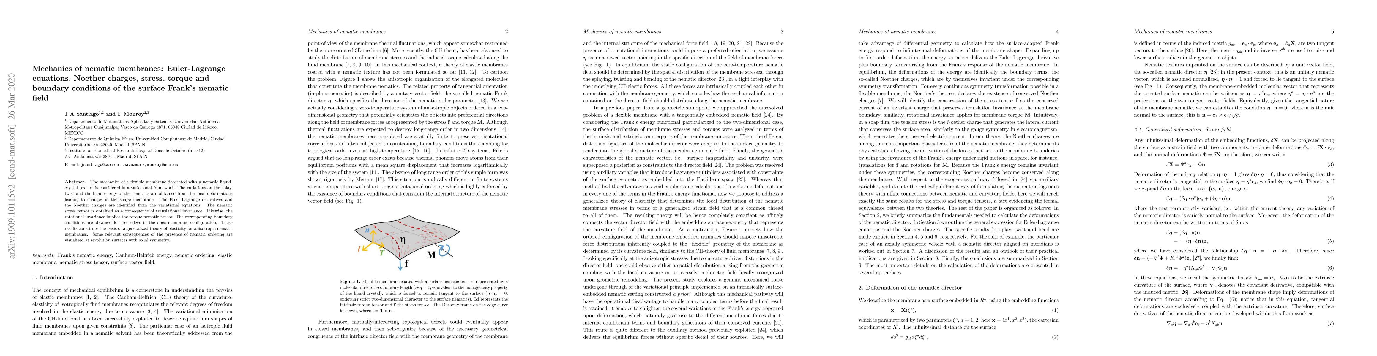 The mechanics of a flexible membrane decorated with a nematic liquid-crystal texture is considered in a variational framework. The variations on the splay, twist and the bend energy of the nematics are obtained from the local deformations leading to changes in the shape membrane. The Euler-Lagrange derivatives and the Noether charges are identified from the variational equations. The nematic stress tensor is obtained as a consequence of translational invariance. Likewise, the rotational invariance implies the torque nematic tensor. The corresponding boundary conditions are obtained for free edges in the open-membrane configuration. These results constitute the basis of a generalized theory of elasticity for anisotropic nematic membranes. Some relevant consequences of the presence of nematic ordering are visualized at revolution surfaces with axial symmetry.