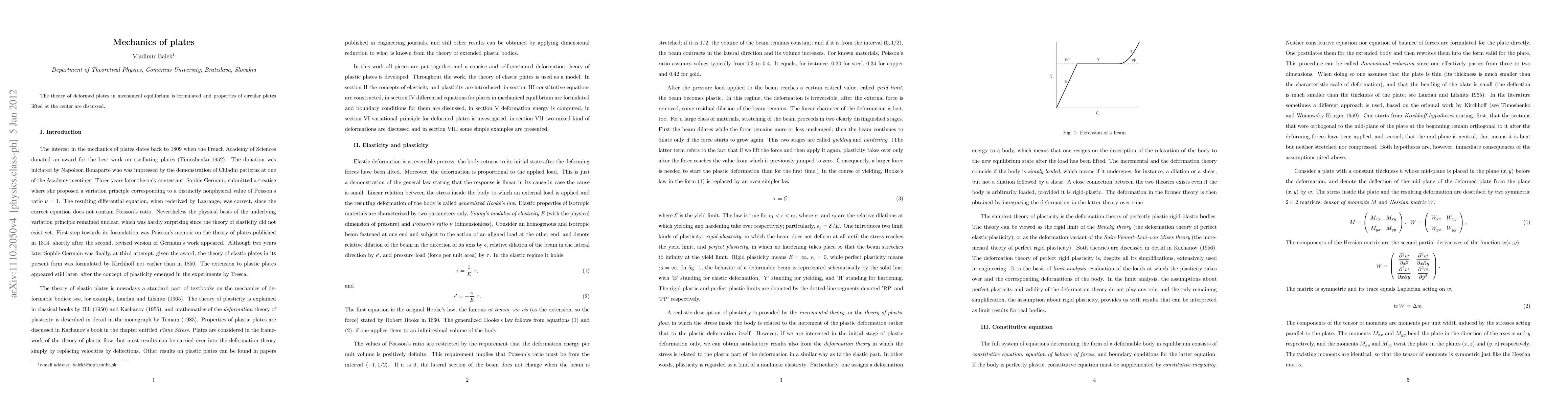 The theory of deformed plates in mechanical equilibrium is formulated and properties of circular plates lifted at the center are discussed.