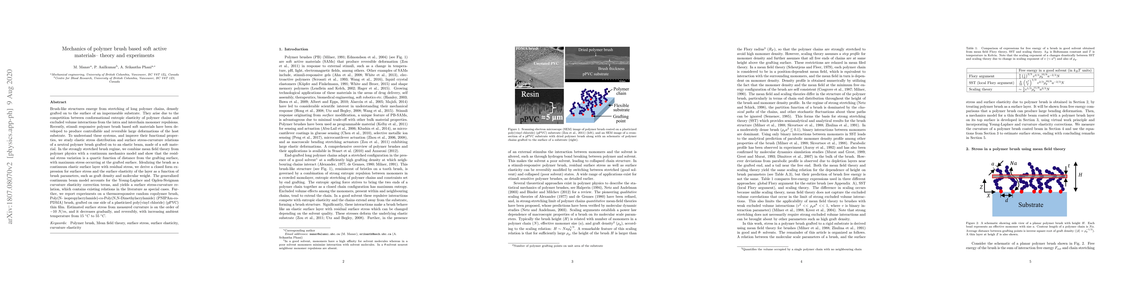 This paper combines theoretical and experimental approaches to study the mechanics of polymer brush-based soft active materials, focusing on elastic stress distribution and surface stress-curvature relations. Theoretical models predict a quartic stress variation with distance from the grafting surface, while experiments on thermoresponsive copolymer brushes show reversible surface stress changes with temperature.