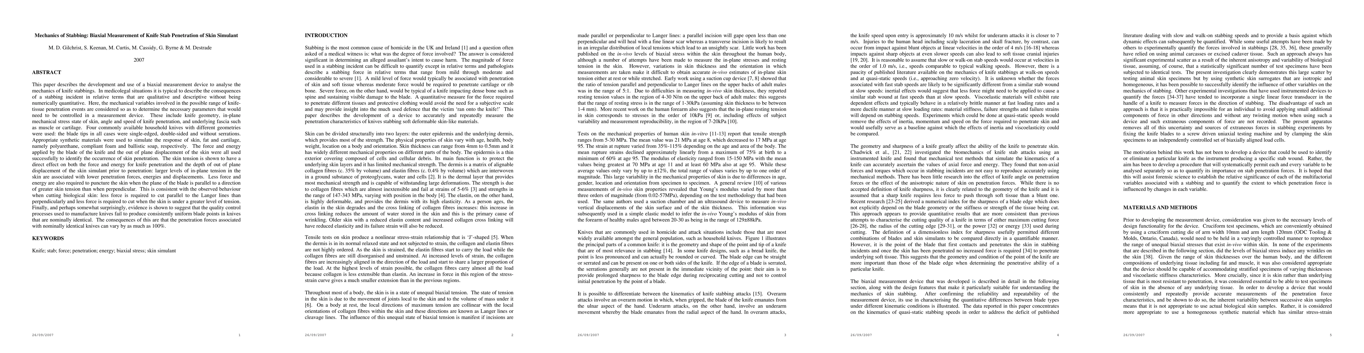 In medicolegal situations, the consequences of a stabbing incident are described in terms that are qualitative without being quantitative. Here, the mechanical variables involved in knife-tissue penetration events are used to determine the parameters needed to be controlled in a measurement device. They include knife geometry, in-plane mechanical stress state of skin, angle and speed of knife penetration, and underlying fascia. Four household knives with different geometries were used. Synthetic materials were used to simulate the response of skin, fat and cartilage: polyurethane, foam, and ballistic soap, respectively. The force and energy applied by the blade and the skin displacement were used to identify skin penetration. The skin tension is shown to have a direct effect on the force and energy for knife penetration and on the depth of displacement of the simulant prior to penetration: larger levels of in-plane tension in the skin are associated with lower penetration forces, energies and displacements. Less force and energy are required for puncture when the blade is parallel to a direction of greater skin tension than when perpendicular. Surprisingly, evidence suggests that the quality control processes used to manufacture knives fail to produce consistently uniform blade points in nominally identical knives, leading to penetration forces which can vary widely.