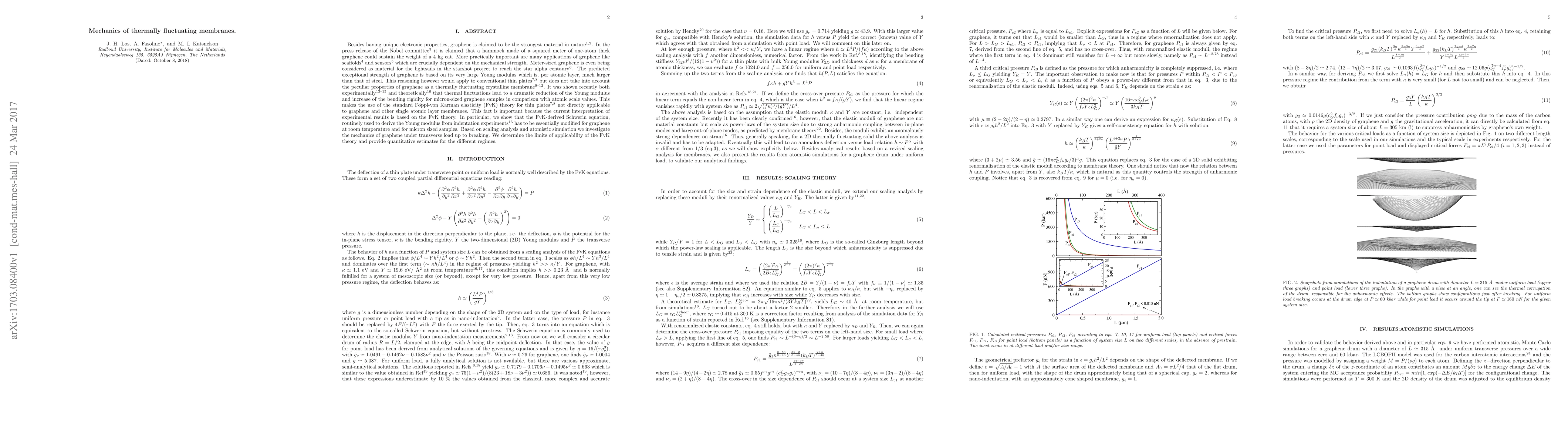 Besides having unique electronic properties, graphene is claimed to be the strongest material in nature. In the press release of the Nobel committee it is claimed that a hammock made of a squared meter of one-atom thick graphene could sustain the wight of a 4 kg cat. More practically important are applications of graphene like scaffolds and sensors which are crucially dependent on the mechanical strength. Meter-sized graphene is even being considered for the lightsails in the starshot project to reach the star alpha centaury. The predicted strength of graphene is based on its very large Young modulus which is, per atomic layer, much larger than that of steel. This reasoning however would apply to conventional thin plates but does not take into account the peculiar properties of graphene as a thermally fluctuating crystalline membrane. It was shown recently both experimentally and theoretically that thermal fluctuations lead to a dramatic reduction of the Young modulus and increase of the bending rigidity for micron-sized graphene samples in comparison with atomic scale values. This makes the use of the standard F\"oppl-von Karman elasticity (FvK) theory for thin plates not directly applicable to graphene and other single atomic layer membranes. This fact is important because the current interpretation of experimental results is based on the FvK theory. In particular, we show that the FvK-derived Schwerin equation, routinely used to derive the Young modulus from indentation experiments has to be essentially modified for graphene at room temperature and for micron sized samples. Based on scaling analysis and atomistic simulation we investigate the mechanics of graphene under transverse load up to breaking. We determine the limits of applicability of the FvK theory and provide quantitative estimates for the different regimes.
