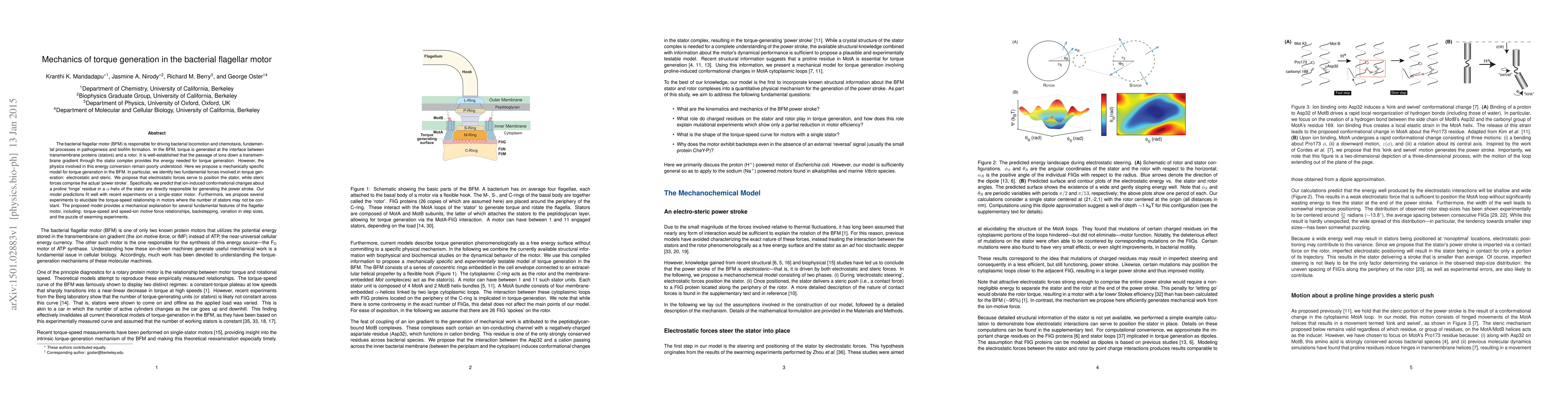 This paper proposes a mechanically specific model for torque generation in the bacterial flagellar motor, identifying electrostatic and steric forces as fundamental contributors. It suggests that ion-induced conformational changes around a proline 'hinge' in the stator's $\alpha$-helix generate the power stroke, fitting well with recent experimental data.