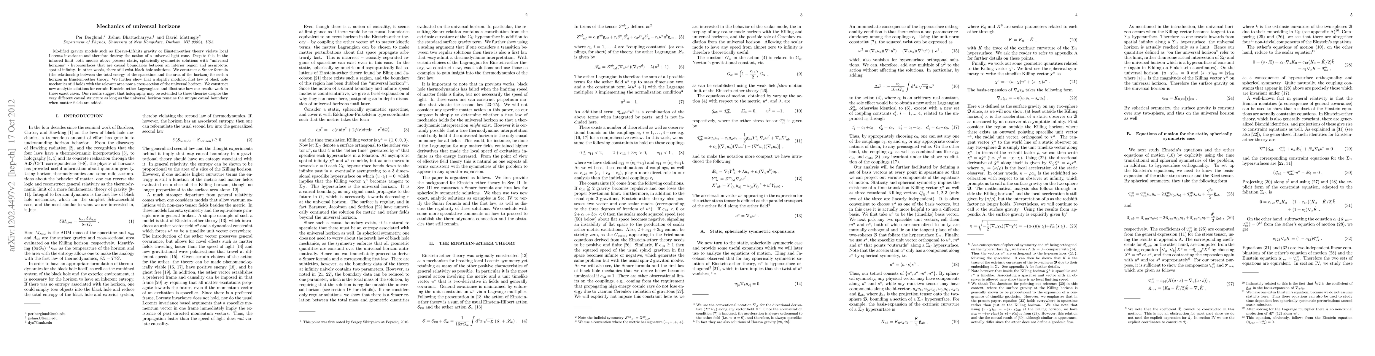 Modified gravity models such as Ho\v{r}ava-Lifshitz gravity or Einstein-{\ae}ther theory violate local Lorentz invariance and therefore destroy the notion of a universal light cone. Despite this, in the infrared limit both models above possess static, spherically symmetric solutions with "universal horizons" - hypersurfaces that are causal boundaries between an interior region and asymptotic spatial infinity. In other words, there still exist black hole solutions. We construct a Smarr formula (the relationship between the total energy of the spacetime and the area of the horizon) for such a horizon in Einstein-{\ae}ther theory. We further show that a slightly modified first law of black hole mechanics still holds with the relevant area now a cross-section of the universal horizon. We construct new analytic solutions for certain Einstein-{\ae}ther Lagrangians and illustrate how our results work in these exact cases. Our results suggest that holography may be extended to these theories despite the very different causal structure as long as the universal horizon remains the unique causal boundary when matter fields are added.