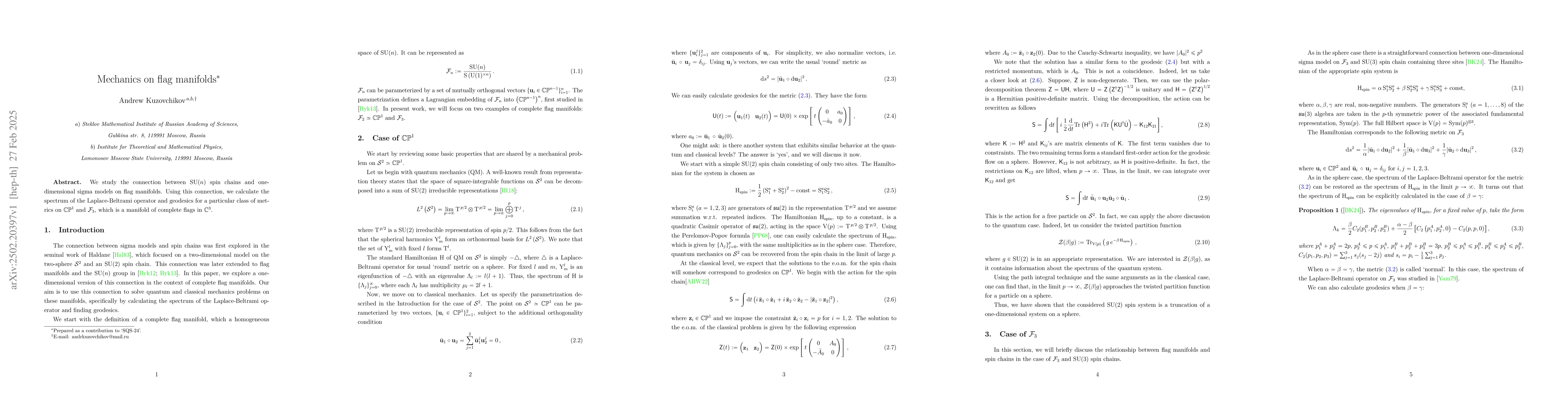 The paper presents a detailed analysis of the Laplace-Beltrami operator spectrum and geodesics on flag manifolds, linking them to spin chains through representation theory.