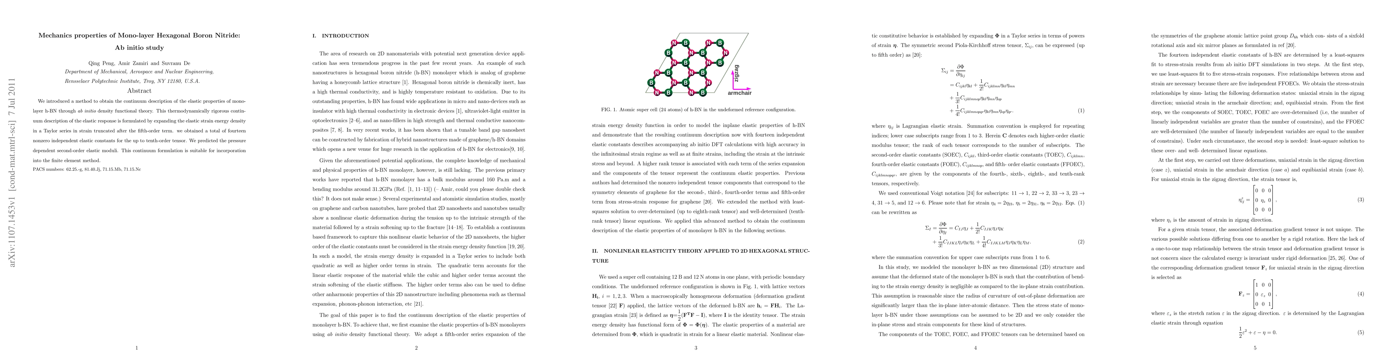 This study uses ab initio density functional theory to derive the elastic properties of monolayer hexagonal boron nitride (h-BN), formulating a continuum description that includes up to the fifth-order strain term. The research predicts pressure-dependent second-order elastic moduli and provides a set of fourteen independent elastic constants, suitable for finite element modeling.