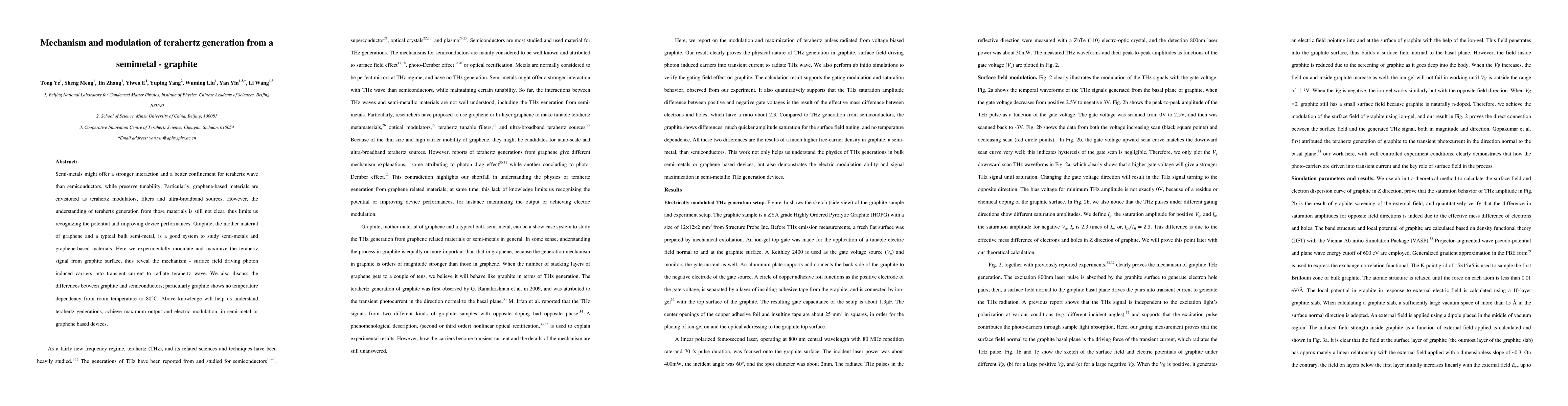 Semi-metals might offer a stronger interaction and a better confinement for terahertz wave than semiconductors, while preserve tunability. Particularly, graphene-based materials are envisioned as terahertz modulators, filters and ultra-broadband sources. However, the understanding of terahertz generation from those materials is still not clear, thus limits us recognizing the potential and improving device performances. Graphite, the mother material of graphene and a typical bulk semi-metal, is a good system to study semi-metals and graphene-based materials. Here we experimentally modulate and maximize the terahertz signal from graphite surface, thus reveal the mechanism - surface field driving photon induced carriers into transient current to radiate terahertz wave. We also discuss the differences between graphite and semiconductors; particularly graphite shows no temperature dependency from room temperature to 80C. Above knowledge will help us understand terahertz generations, achieve maximum output and electric modulation, in semi-metal or graphene based devices.