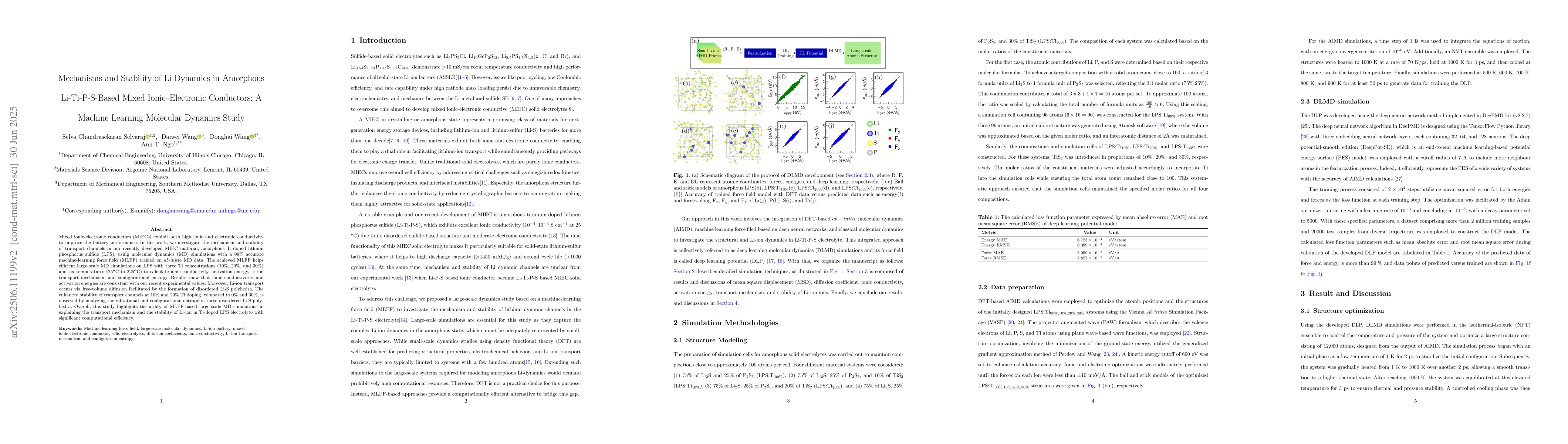 Mixed ionic-electronic conductor (MIEC) exhibit both high ionic and electronic conductivity to improve the battery performance. In this work, we investigate the mechanism and stability of transport channels in recently developed our MIEC material, amorphous Ti-doped lithium phosphorus sulfide (LPS), using molecular dynamics (MD) simulations with a 99\% accurate machine-learning force field (MLFF) trained on \textit{ab-initio} MD data. The achieved MLFF helps efficient large-scale MD simulations on LPS with three Ti concentrations (10\%, 20\%, and 30\%) and six temperatures (25$^\mathrm{o}$C to 225$^\mathrm{o}$C) to calculate ionic conductivity, activation energy, Li-ion transport mechanism, and configurational entropy. Results show that ionic conductivities and activation energies are consistent with our recent experimental values. Moreover, Li-ion transport occurs via free-volume diffusion facilitated by the formation of disordered Li-S polyhedra. Enhanced stability of transport channels at 10\% and 20\% Ti doping, compared to 0\% and 30\%, is observed through the analysis of the vibrational and configurational entropy of these disordered Li-S polyhedra. Overall, this study highlights the utility of MLFF-based large-scale MD simulations in explaining the transport mechanism and its stability of Li-ion in Ti doped LPS electrolyte with significant computational efficiency.