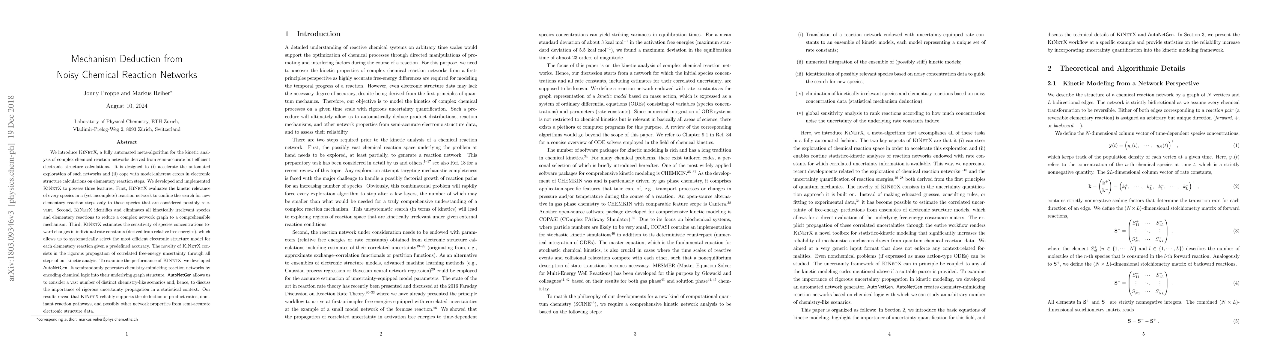 We introduce KiNetX, a fully automated meta-algorithm for the kinetic analysis of complex chemical reaction networks derived from semi-accurate but efficient electronic structure calculations. It is designed to (i) accelerate the automated exploration of such networks, and (ii) cope with model-inherent errors in electronic structure calculations on elementary reaction steps. We developed and implemented KiNetX to possess three features. First, KiNetX evaluates the kinetic relevance of every species in a (yet incomplete) reaction network to confine the search for new elementary reaction steps only to those species that are considered possibly relevant. Second, KiNetX identifies and eliminates all kinetically irrelevant species and elementary reactions to reduce a complex network graph to a comprehensible mechanism. Third, KiNetX estimates the sensitivity of species concentrations toward changes in individual rate constants (derived from relative free energies), which allows us to systematically select the most efficient electronic structure model for each elementary reaction given a predefined accuracy. The novelty of KiNetX consists in the rigorous propagation of correlated free-energy uncertainty through all steps of our kinetic analyis. To examine the performance of KiNetX, we developed AutoNetGen. It semirandomly generates chemistry-mimicking reaction networks by encoding chemical logic into their underlying graph structure. AutoNetGen allows us to consider a vast number of distinct chemistry-like scenarios and, hence, to discuss assess the importance of rigorous uncertainty propagation in a statistical context. Our results reveal that KiNetX reliably supports the deduction of product ratios, dominant reaction pathways, and possibly other network properties from semi-accurate electronic structure data.