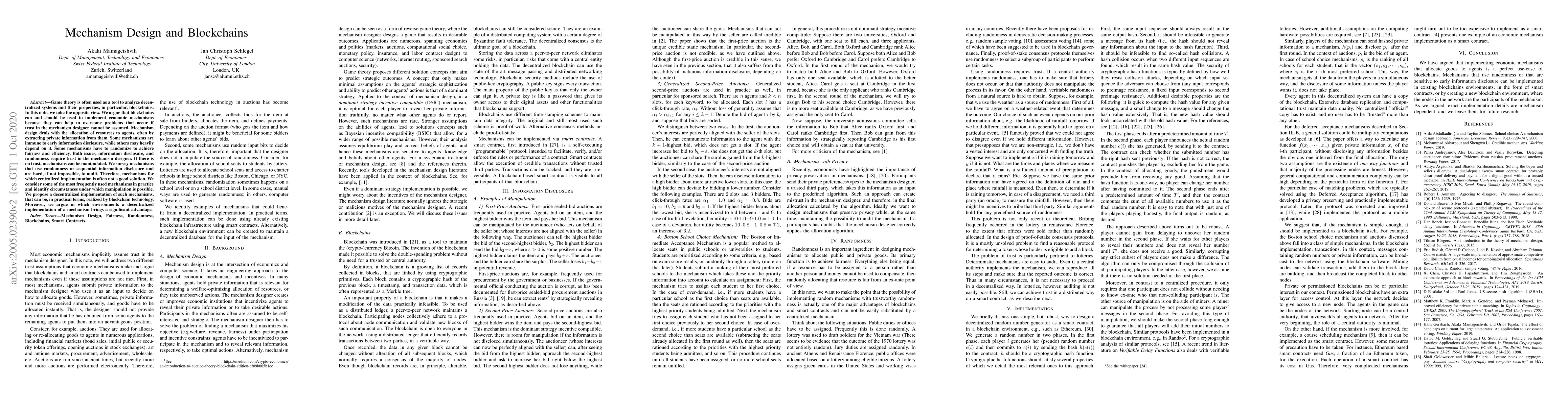 Game theory is often used as a tool to analyze decentralized systems and their properties, in particular, blockchains. In this note, we take the opposite view. We argue that blockchains can and should be used to implement economic mechanisms because they can help to overcome problems that occur if trust in the mechanism designer cannot be assumed. Mechanism design deals with the allocation of resources to agents, often by extracting private information from them. Some mechanisms are immune to early information disclosure, while others may heavily depend on it. Some mechanisms have to randomize to achieve fairness and efficiency. Both issues, information disclosure, and randomness require trust in the mechanism designer. If there is no trust, mechanisms can be manipulated. We claim that mechanisms that use randomness or sequential information disclosure are much harder, if not impossible, to audit. Therefore, centralized implementation is often not a good solution. We consider some of the most frequently used mechanisms in practice and identify circumstances under which manipulation is possible. We propose a decentralized implementation of such mechanisms, that can be, in practical terms, realized by blockchain technology. Moreover, we argue in which environments a decentralized implementation of a mechanism brings a significant advantage.