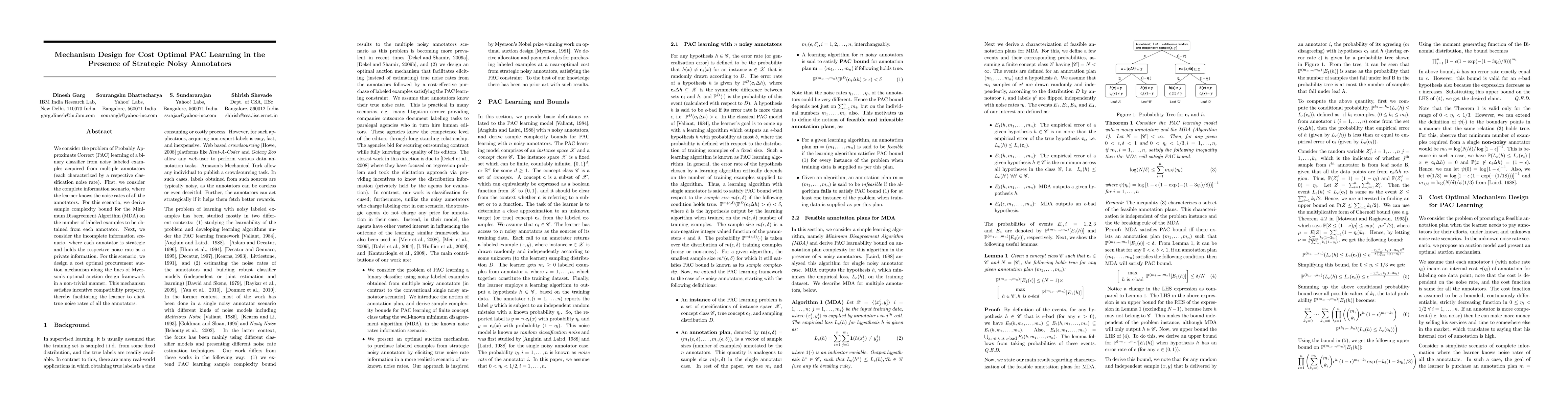 We consider the problem of Probably Approximate Correct (PAC) learning of a binary classifier from noisy labeled examples acquired from multiple annotators (each characterized by a respective classification noise rate). First, we consider the complete information scenario, where the learner knows the noise rates of all the annotators. For this scenario, we derive sample complexity bound for the Minimum Disagreement Algorithm (MDA) on the number of labeled examples to be obtained from each annotator. Next, we consider the incomplete information scenario, where each annotator is strategic and holds the respective noise rate as a private information. For this scenario, we design a cost optimal procurement auction mechanism along the lines of Myerson's optimal auction design framework in a non-trivial manner. This mechanism satisfies incentive compatibility property, thereby facilitating the learner to elicit true noise rates of all the annotators.