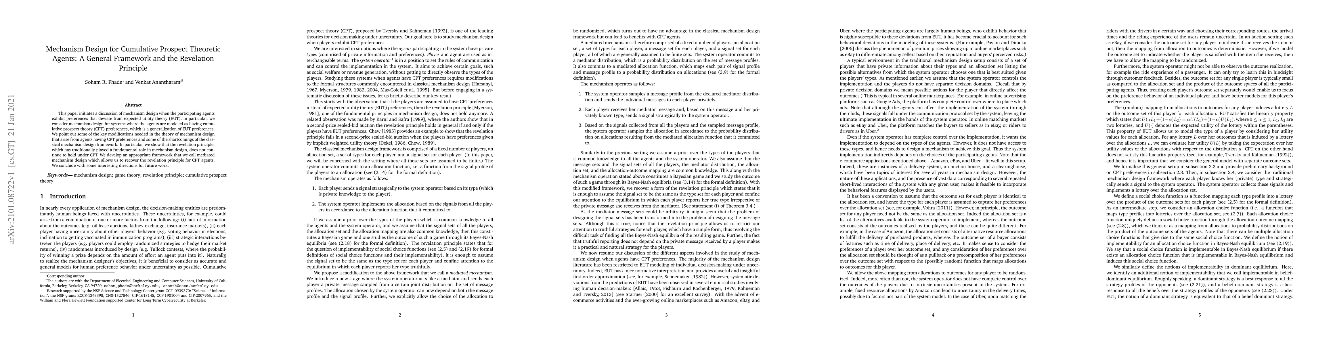 This paper explores mechanism design for agents with cumulative prospect theory (CPT) preferences, highlighting modifications needed from traditional expected utility theory (EUT) and demonstrating that the revelation principle does not apply under CPT. It introduces a new framework called mediated mechanism design to restore the revelation principle for CPT agents.