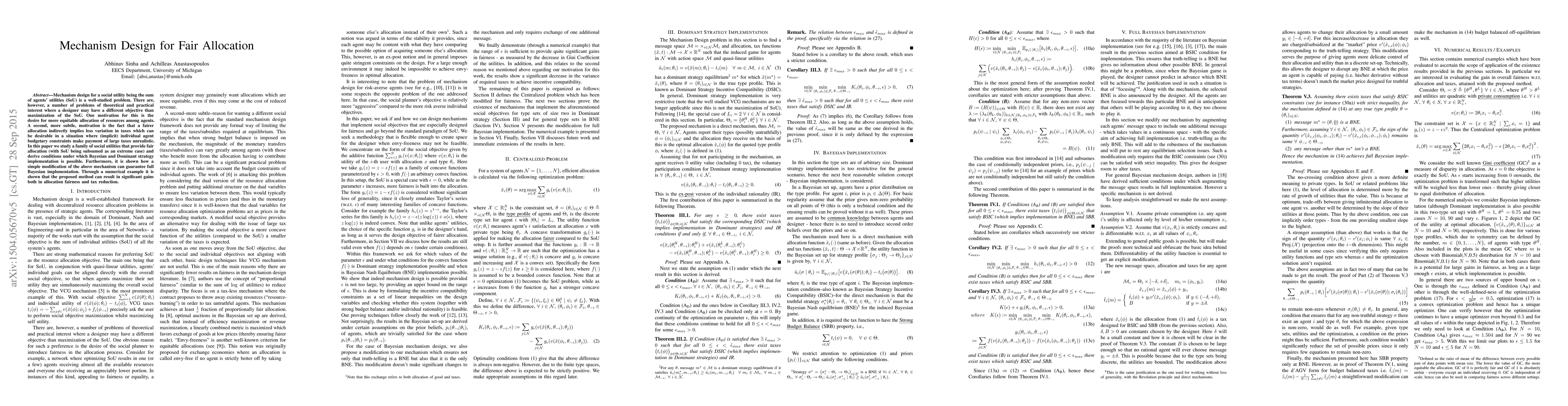 This paper explores mechanisms for fair resource allocation beyond maximizing social utility, focusing on equitable distribution and reduced tax variation. It proposes a family of social utility functions that achieve fairer allocations and demonstrates conditions for Bayesian and dominant strategy implementation, with a numerical example showing significant gains in fairness and tax reduction.