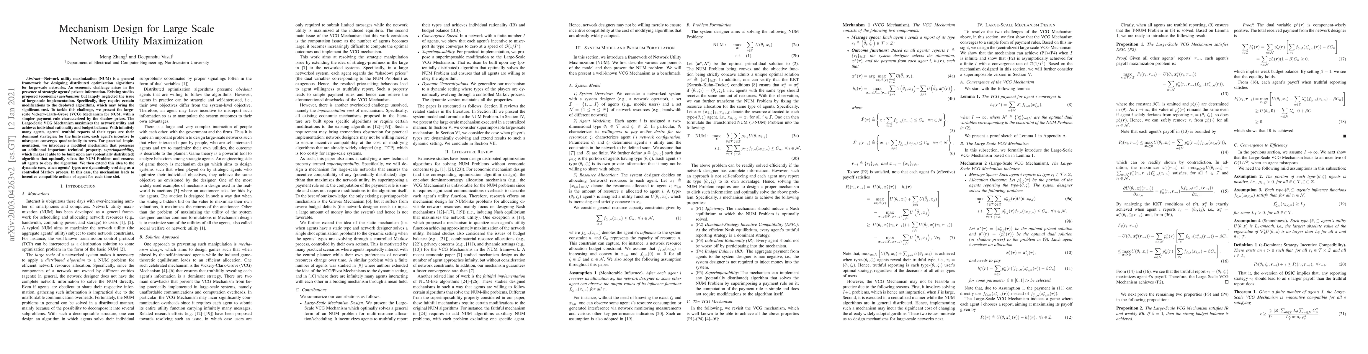 Network utility maximization (NUM) is a general framework for designing distributed optimization algorithms for large-scale networks. An economic challenge arises in the presence of strategic agents' private information. Existing studies proposed (economic) mechanisms but largely neglected the issue of large-scale implementation. Specifically, they require certain modifications to the deployed algorithms, which may bring the significant cost. To tackle this challenge, we present the large-scale Vickery-Clark-Grove (VCG) Mechanism for NUM, with a simpler payment rule characterized by the shadow prices. The Large-Scale VCG Mechanism maximizes the network utility and achieves individual rationality and budget balance. With infinitely many agents, agents' truthful reports of their types are their dominant strategies; for the finite case, each agent's incentive to misreport converges quadratically to zero. For practical implementation, we introduce a modified mechanism that possesses an additional important technical property, superimposability, which makes it able to be built upon any (potentially distributed) algorithm that optimally solves the NUM Problem and ensures all agents to obey the algorithm. We then extend this idea to the dynamic case, when agents' types are dynamically evolving as a controlled Markov process. In this case, the mechanism leads to incentive compatible actions of agent for each time slot.