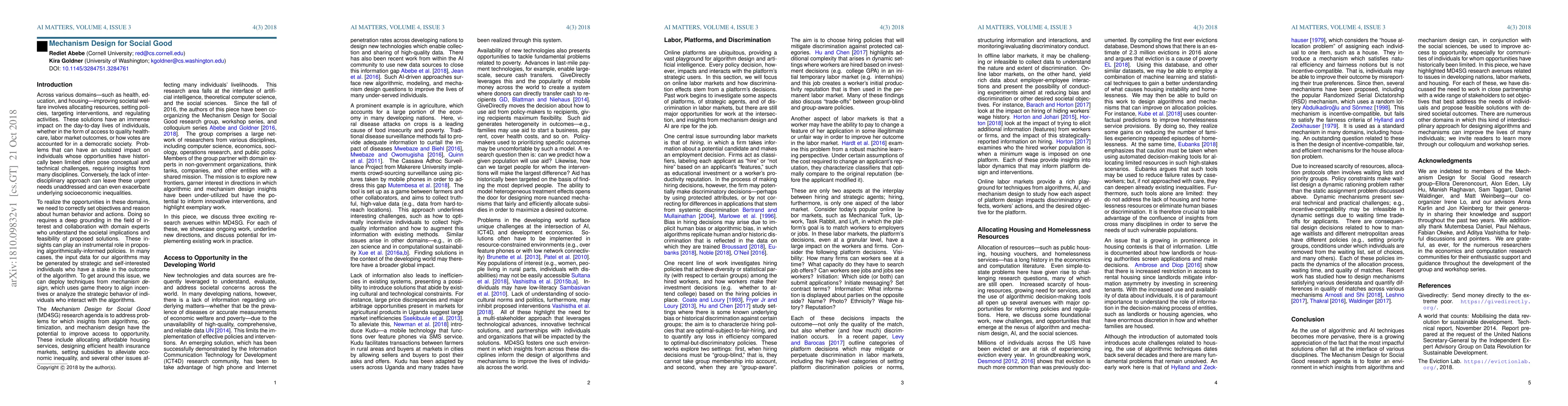 Across various domains--such as health, education, and housing--improving societal welfare involves allocating resources, setting policies, targeting interventions, and regulating activities. These solutions have an immense impact on the day-to-day lives of individuals, whether in the form of access to quality healthcare, labor market outcomes, or how votes are accounted for in a democratic society. Problems that can have an out-sized impact on individuals whose opportunities have historically been limited often pose conceptual and technical challenges, requiring insights from many disciplines. Conversely, the lack of interdisciplinary approach can leave these urgent needs unaddressed and can even exacerbate underlying socioeconomic inequalities. To realize the opportunities in these domains, we need to correctly set objectives and reason about human behavior and actions. Doing so requires a deep grounding in the field of interest and collaboration with domain experts who understand the societal implications and feasibility of proposed solutions. These insights can play an instrumental role in proposing algorithmically-informed policies. In this article, we describe the Mechanism Design for Social Good (MD4SG) research agenda, which involves using insights from algorithms, optimization, and mechanism design to improve access to opportunity. The MD4SG research community takes an interdisciplinary, multi-stakeholder approach to improve societal welfare. We discuss three exciting research avenues within MD4SG related to improving access to opportunity in the developing world, labor markets and discrimination, and housing. For each of these, we showcase ongoing work, underline new directions, and discuss potential for implementing existing work in practice.