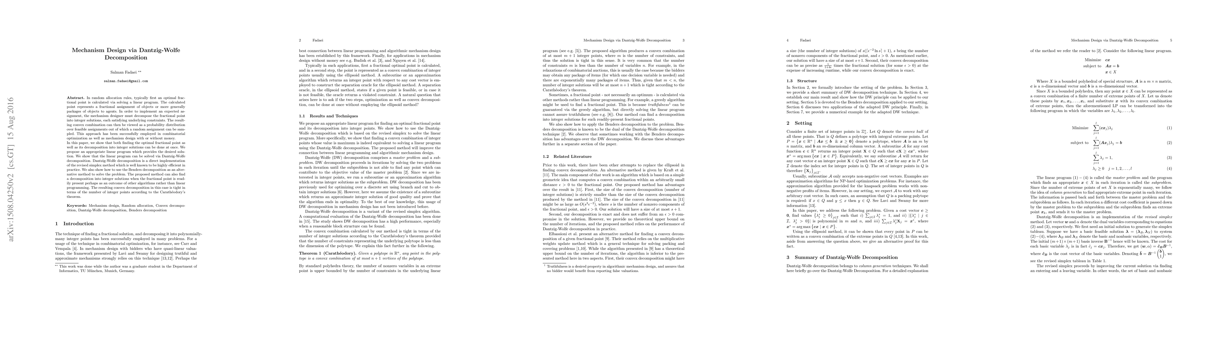 The paper proposes a method for mechanism design using Dantzig-Wolfe decomposition, combining the calculation of an optimal fractional point with its decomposition into integer solutions in a single linear program, solvable via Dantzig-Wolfe decomposition or Benders decomposition.