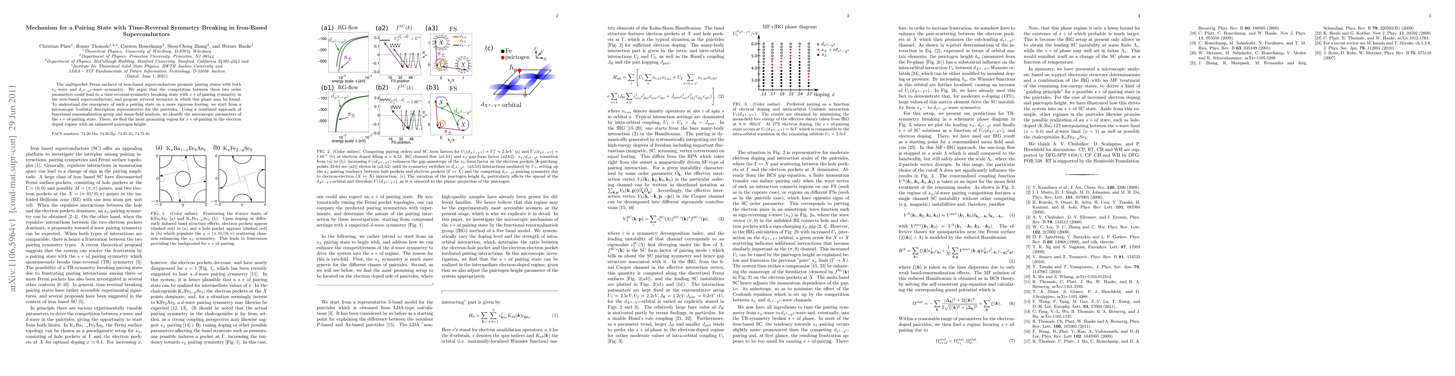 This paper explores the potential for a time-reversal-symmetry breaking pairing state in iron-based superconductors, proposing an s+id-pairing symmetry due to competition between s_{+-}-wave and d_{x^2-y^2}-wave order parameters. It uses a 5-orbital model and functional renormalization group analysis to identify conditions favoring this pairing state, particularly in electron-doped pnictides.