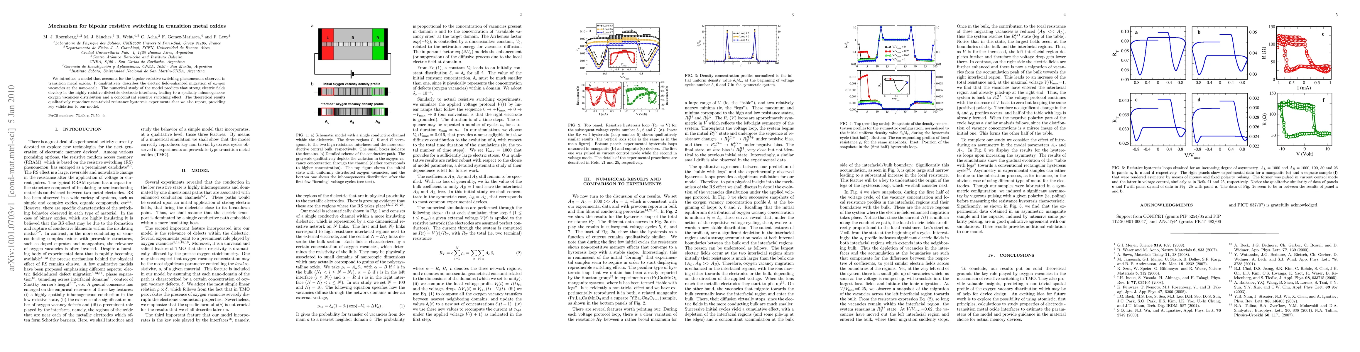 This paper proposes a model explaining bipolar resistive switching in transition metal oxides, attributing it to electric field-induced migration of oxygen vacancies. The model predicts strong electric fields at dielectric-electrode interfaces, resulting in a non-uniform oxygen vacancy distribution and resistive switching, validated by experimental resistance hysteresis data.