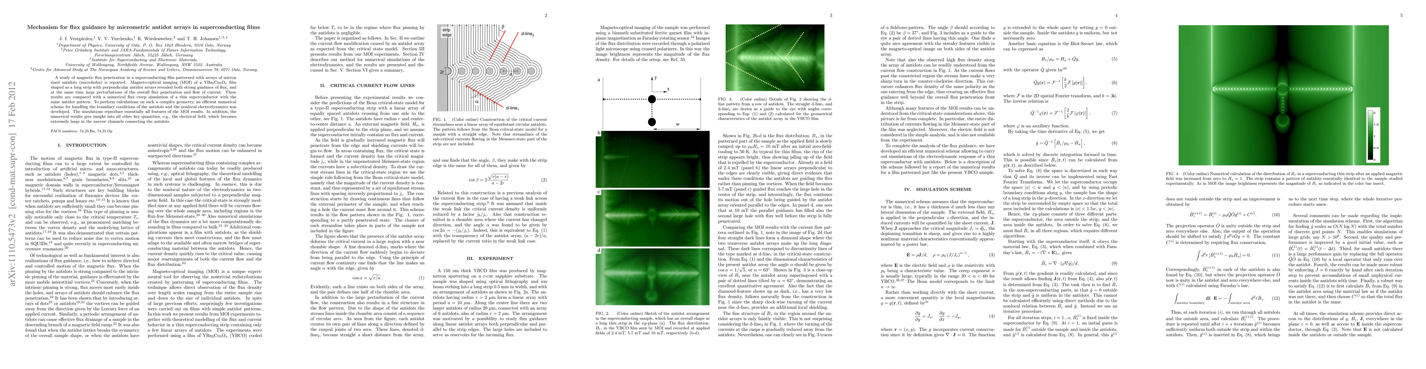 This research investigates magnetic flux penetration in superconducting films with micron-sized antidot arrays using magneto-optical imaging and numerical simulations. The study reveals strong flux guidance and significant current flow perturbations, with simulations providing insights into the electrical field behavior in the film.