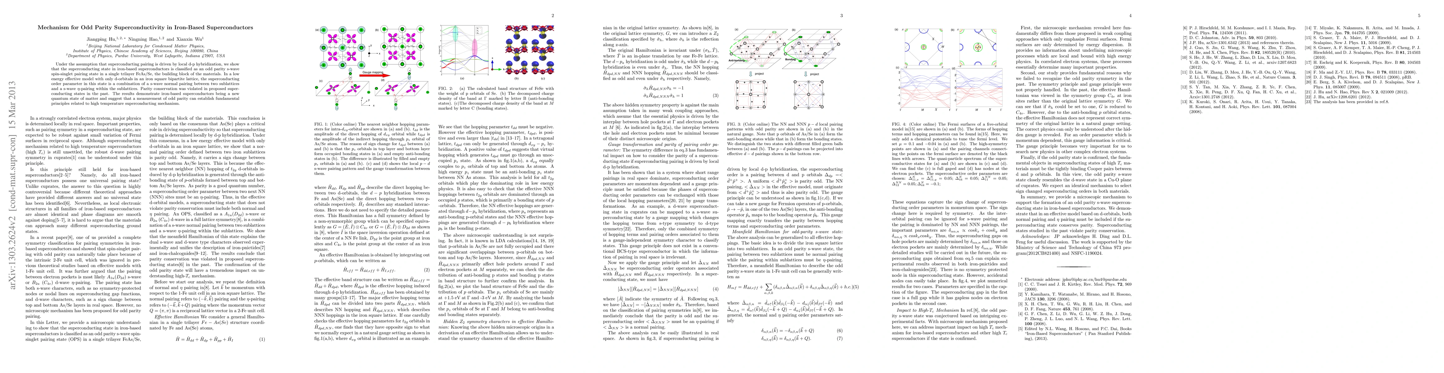 This paper proposes that iron-based superconductors exhibit odd parity s-wave spin-singlet pairing driven by d-p hybridization, characterized by a combination of s-wave pairing across sublattices and within them. This challenges previous parity-conserving models and suggests a new quantum state of matter in high-temperature superconductivity.