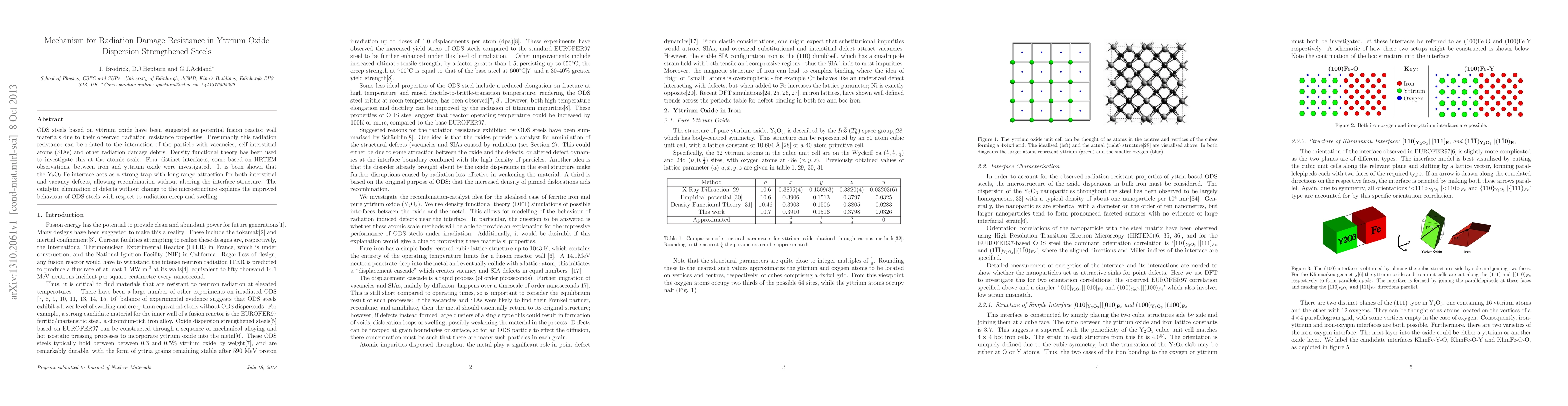 This research investigates the radiation damage resistance in Yttrium Oxide Dispersion Strengthened (ODS) steels using density functional theory, revealing that the Y$_2$O$_3$-Fe interface acts as a strong trap for defects, facilitating their recombination without altering the microstructure, which explains the enhanced resistance to radiation creep and swelling.