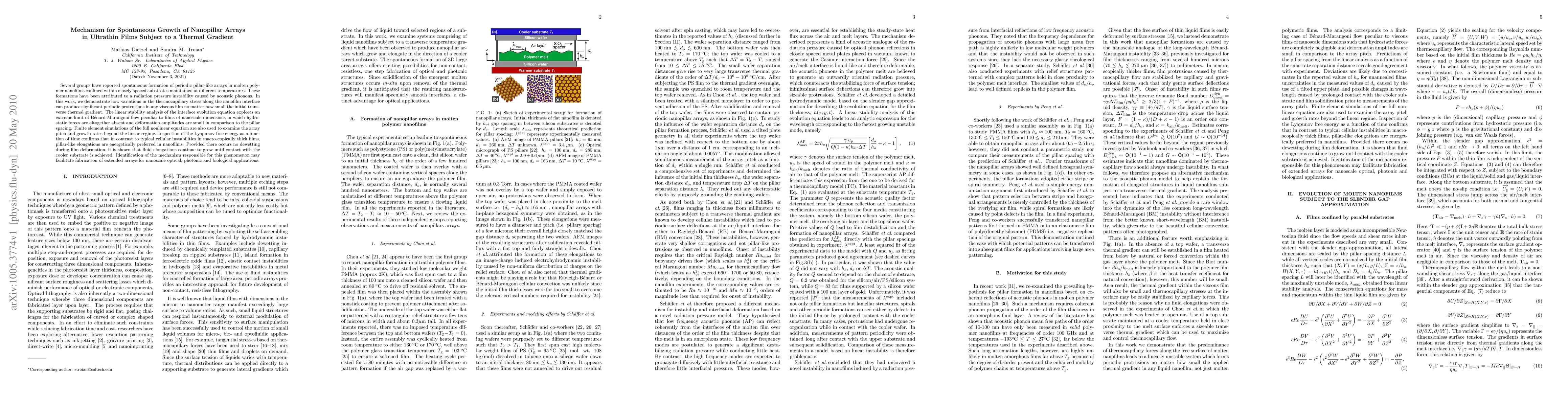 Several groups have reported spontaneous formation of periodic pillar-like arrays in molten polymer nanofilms confined within closely spaced substrates maintained at different temperatures. These formations have been attributed to a radiation pressure instability caused by acoustic phonons. In this work, we demonstrate how variations in the thermocapillary stress along the nanofilm interface can produce significant periodic protrusions in any viscous film no matter how small the initial transverse thermal gradient. The linear stability analysis of the interface evolution equation explores an extreme limit of B\'{e}nard-Marangoni flow peculiar to films of nanoscale dimensions in which hydrostatic forces are altogether absent and deformation amplitudes are small in comparison to the pillar spacing. Finite element simulations of the full nonlinear equation are also used to examine the array pitch and growth rates beyond the linear regime. Inspection of the Lyapunov free energy as a function of time confirms that in contrast to typical cellular instabilities in macroscopically thick films, pillar-like elongations are energetically preferred in nanofilms. Provided there occurs no dewetting during film deformation, it is shown that fluid elongations continue to grow until contact with the cooler substrate is achieved. Identification of the mechanism responsible for this phenomenon may facilitate fabrication of extended arrays for nanoscale optical, photonic and biological applications.