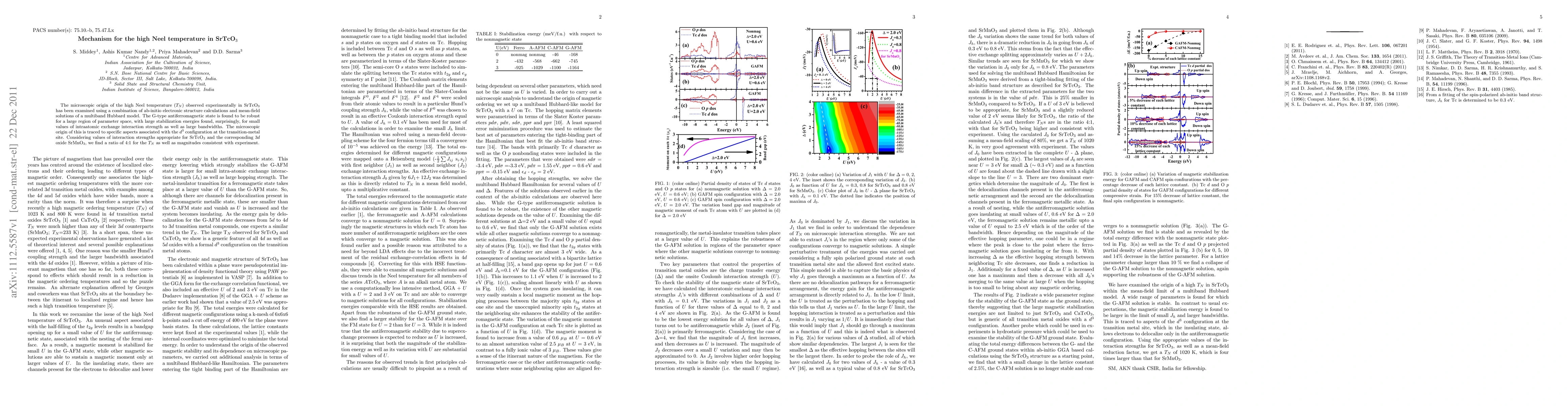 This study uses ab-initio calculations and a multiband Hubbard model to explain the high Neel temperature in SrTcO_3. The research identifies the d3 configuration at the transition-metal site as key, showing stable antiferromagnetic states even with small intraatomic exchange and large bandwidths. It also predicts a 4:1 TN ratio between SrTcO3 and SrMnO3, aligning with experimental values.