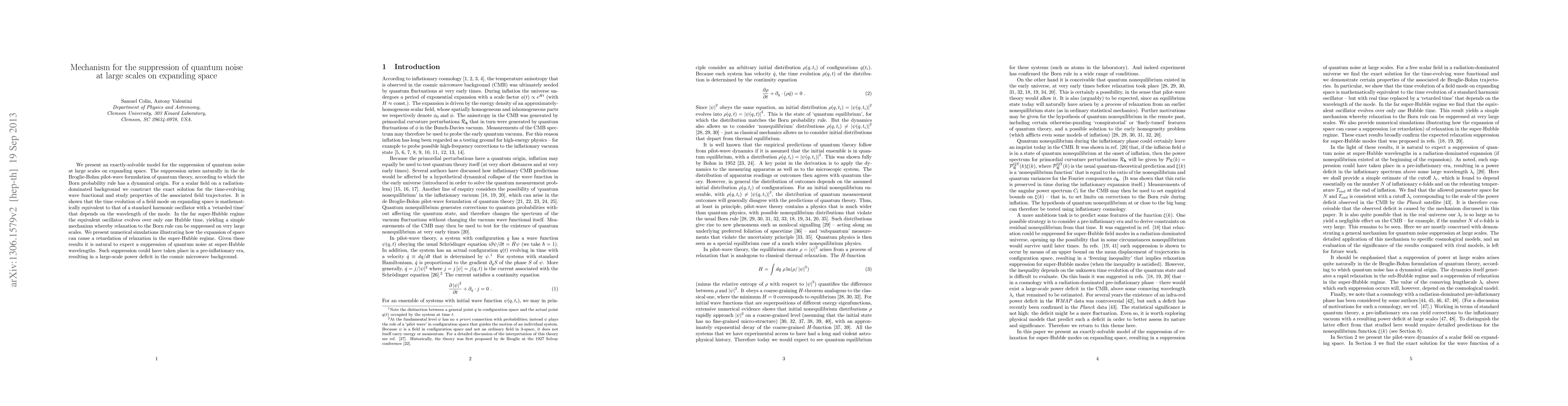 We present an exactly-solvable model for the suppression of quantum noise at large scales on expanding space. The suppression arises naturally in the de Broglie-Bohm pilot-wave formulation of quantum theory, according to which the Born probability rule has a dynamical origin. For a scalar field on a radiation-dominated background we construct the exact solution for the time-evolving wave functional and study properties of the associated field trajectories. It is shown that the time evolution of a field mode on expanding space is mathematically equivalent to that of a standard harmonic oscillator with a 'retarded time' that depends on the wavelength of the mode. In the far super-Hubble regime the equivalent oscillator evolves over only one Hubble time, yielding a simple mechanism whereby relaxation to the Born rule can be suppressed on very large scales. We present numerical simulations illustrating how the expansion of space can cause a retardation of relaxation in the super-Hubble regime. Given these results it is natural to expect a suppression of quantum noise at super-Hubble wavelengths. Such suppression could have taken place in a pre-inflationary era, resulting in a large-scale power deficit in the cosmic microwave background.