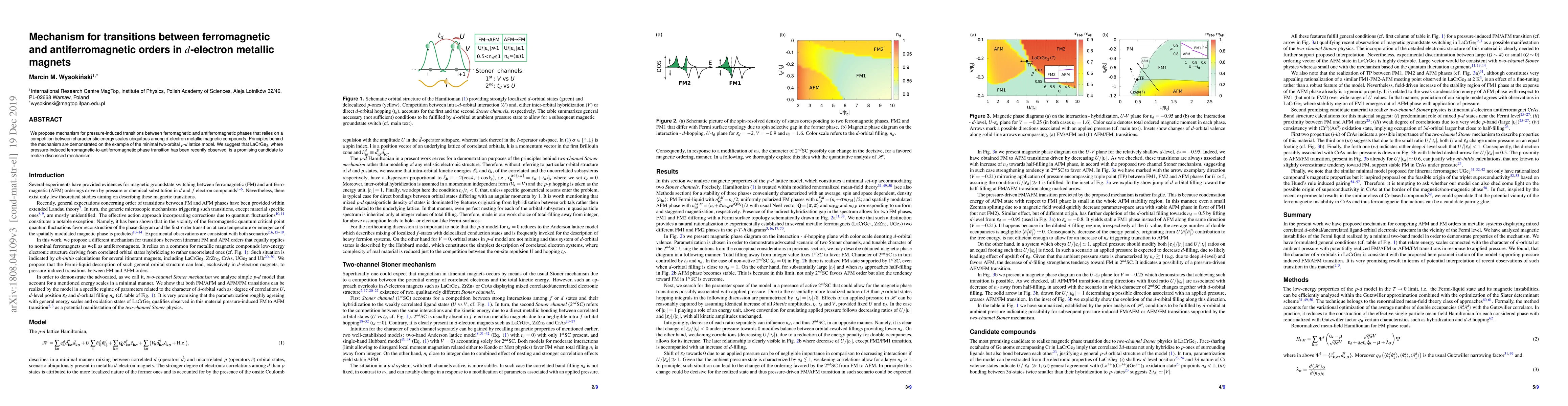 The paper proposes a mechanism for transitions between ferromagnetic and antiferromagnetic orders in d-electron metallic magnets, using a competition between energy scales in a two-orbital p-d lattice model. LaCrGe3 is suggested as a candidate to observe this mechanism, based on recent pressure-induced ferromagnetic-to-antiferromagnetic transition observations.