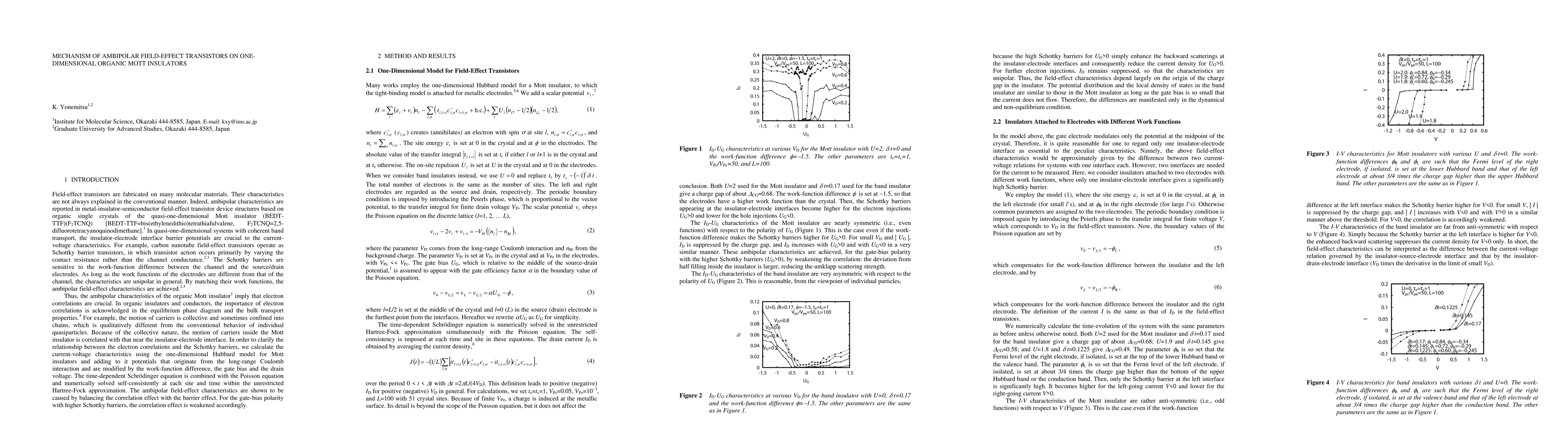 The experimentally observed, ambipolar field-effect characteristics of Mott insulators are reproduced in the one-dimensional Hubbard model attached to a tight-binding model for source and drain electrodes. The formation of Schottky barriers, originating from the work-function difference, is taken into account by a potential satisfying the Poisson equation with an appropriate boundary condition. Then, these field-effect characteristics are shown to be related by unique current-voltage characteristics of metal-Mott-insulator interfaces.