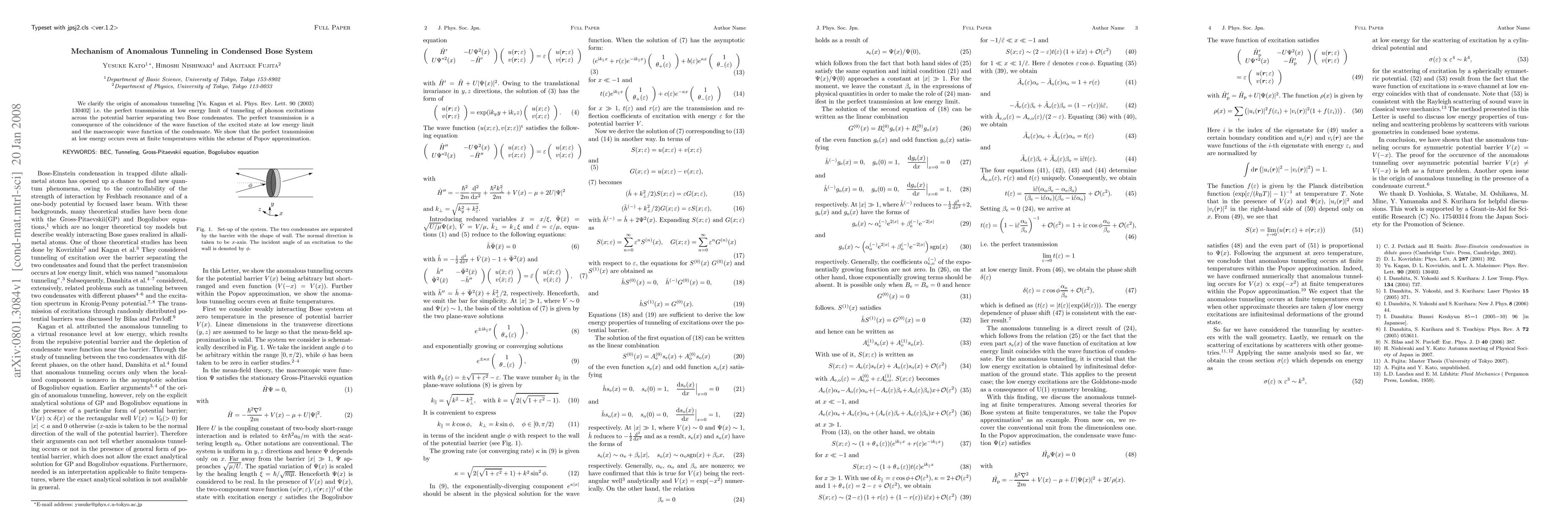 We clarify the origin of anomalous tunneling [Yu. Kagan et al. Phys. Rev. Lett. 90 (2003) 130402] i.e. the perfect transmission at low energy limit of tunneling of phonon excitations across the potential barrier separating two Bose condensates. The perfect transmission is a consequence of the coincidence of the wave function of the excited state at low energy limit and the macroscopic wave function of the condensate. We show that the perfect transmission at low energy occurs even at finite temperatures within the scheme of Popov approximation.