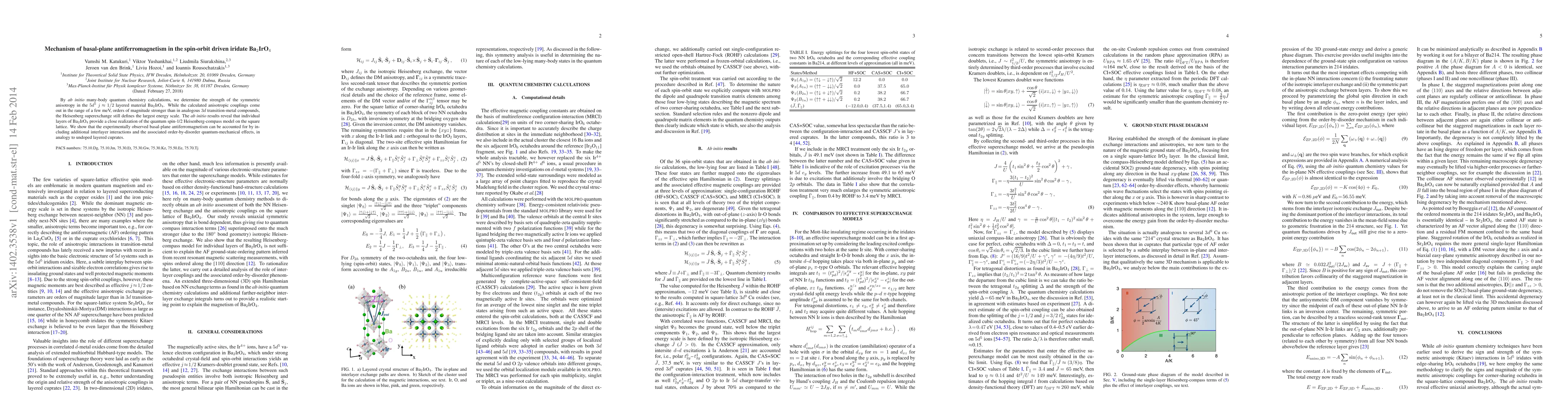 By ab initio many-body quantum chemistry calculations, we determine the strength of the symmetric anisotropy in the 5$d^5$ j $\approx$ 1/2 layered material Ba$_2$IrO$_4$. While the calculated anisotropic couplings come out in the range of a few meV, orders of magnitude stronger than in analogous 3d transition-metal compounds, the Heisenberg superexchange still defines the largest energy scale. The ab initio results reveal that individual layers of Ba$_2$IrO$_4$ provide a close realization of the quantum spin-1/2 Heisenberg-compass model on the square lattice. We show that the experimentally observed basal-plane antiferromagnetism can be accounted for by including additional interlayer interactions and the associated order-by-disorder quantum-mechanical effects, in analogy to undoped layered cuprates.