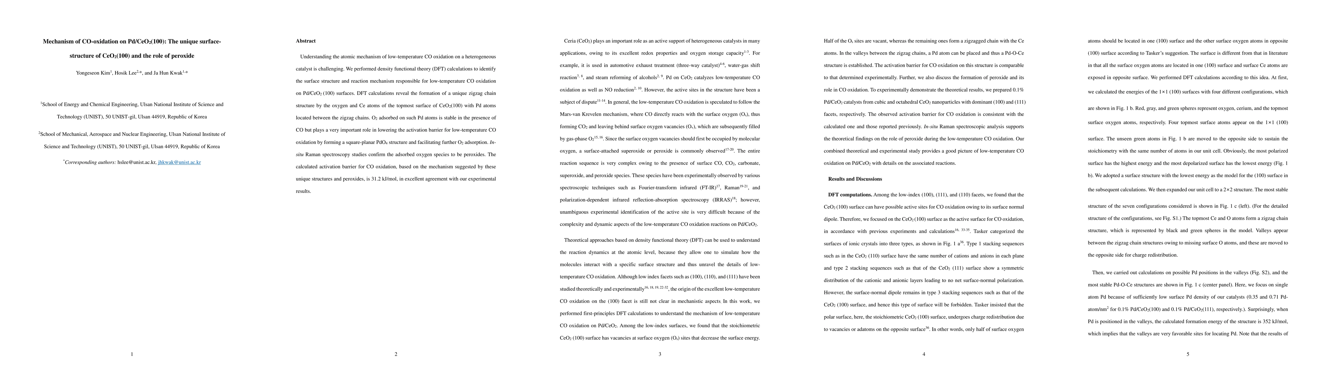 This study uses density functional theory to elucidate the mechanism of CO oxidation on Pd/CeO2(100) surfaces, revealing a unique zigzag chain structure that lowers the activation barrier. The formation of peroxides and a square-planar PdO4 structure facilitates the reaction, with an activation barrier of 31.2 kJ/mol, corroborated by in-situ Raman spectroscopy.