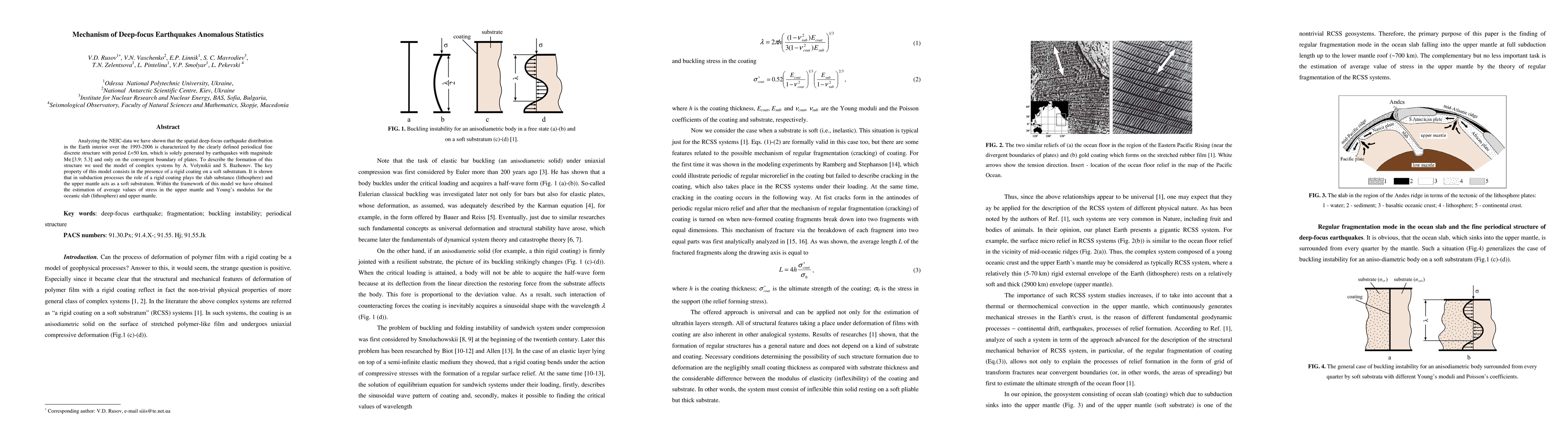 Researchers found a periodic structure in deep-focus earthquakes that occurs only on convergent boundaries with magnitude 3.9-5.3 earthquakes. They used a complex systems model to describe the formation of this structure, estimating stress and material properties in the upper mantle and oceanic slab.
