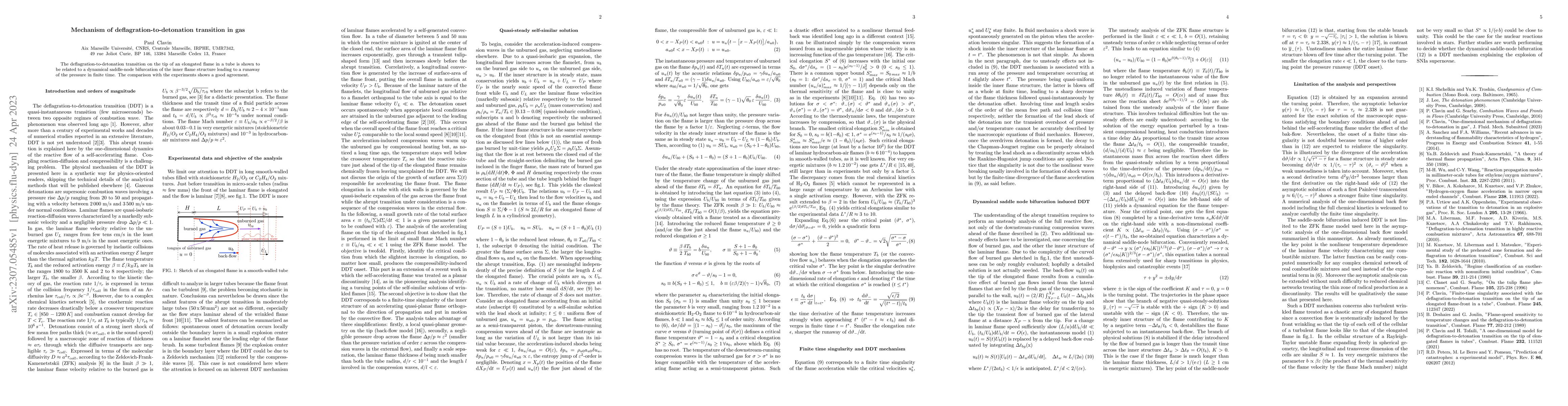 The paper explores how the transition from deflagration to detonation in a gas is driven by a dynamical saddle-node bifurcation of the inner flame structure, resulting in a pressure runaway. Experimental comparisons validate the theoretical findings.
