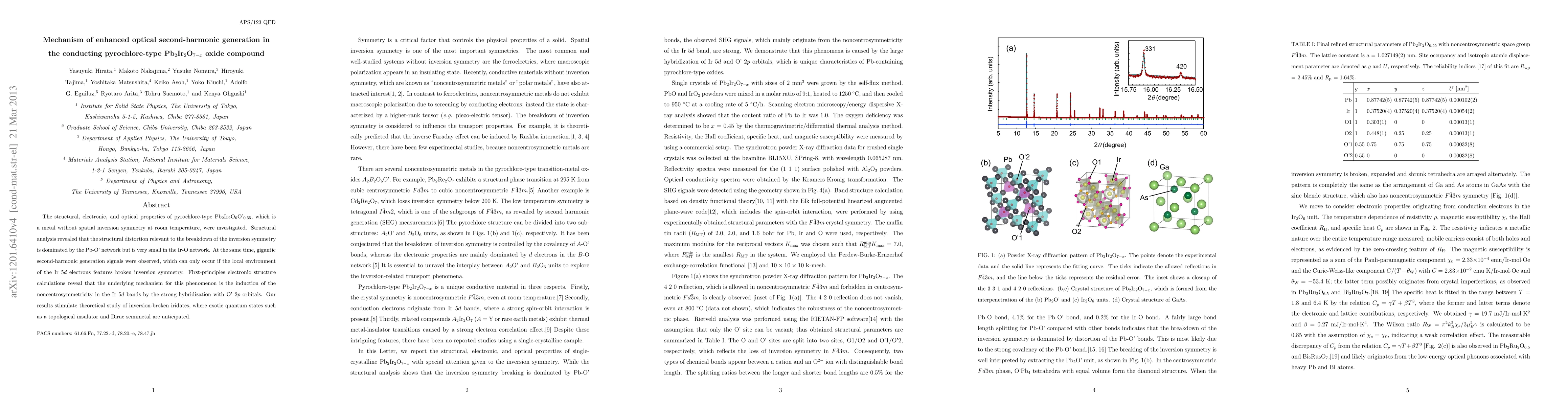 The structural, electronic, and optical properties of pyrochlore-type Pb$_{2}$Ir$_{2}$O$_{6}$O'$_{0.55}$, which is a metal without spatial inversion symmetry at room temperature, were investigated. Structural analysis revealed that the structural distortion relevant to the breakdown of the inversion symmetry is dominated by the Pb-O' network but is very small in the Ir-O network. At the same time, gigantic second-harmonic generation signals were observed, which can only occur if the local environment of the Ir 5$d$ electrons features broken inversion symmetry. First-principles electronic structure calculations reveal that the underlying mechanism for this phenomenon is the induction of the noncentrosymmetricity in the Ir 5$d$ bands by the strong hybridization with O' 2$p$ orbitals. Our results stimulate theoretical study of inversion-broken iridates, where exotic quantum states such as a topological insulator and Dirac semimetal are anticipated.