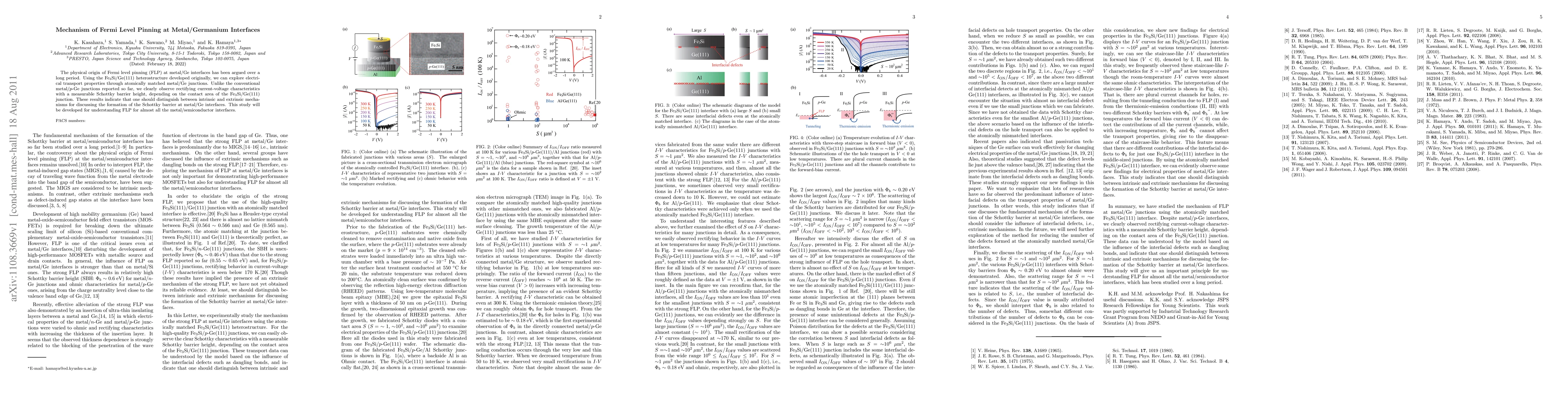 The physical origin of Fermi level pinning (FLP) at metal/Ge interfaces has been argued over a long period. Using the Fe$_{3}$Si/Ge(111) heterostructure developed originally, we can explore electrical transport properties through atomically matched metal/Ge junctions. Unlike the conventional metal/$p$-Ge junctions reported so far, we clearly observe rectifying current-voltage characteristics with a measurable Schottky barrier height, depending on the contact area of the Fe$_{3}$Si/Ge(111) junction. These results indicate that one should distinguish between intrinsic and extrinsic mechanisms for discussing the formation of the Schottky barrier at metal/Ge interfaces. This study will be developed for understanding FLP for almost all the metal/semiconductor interfaces.