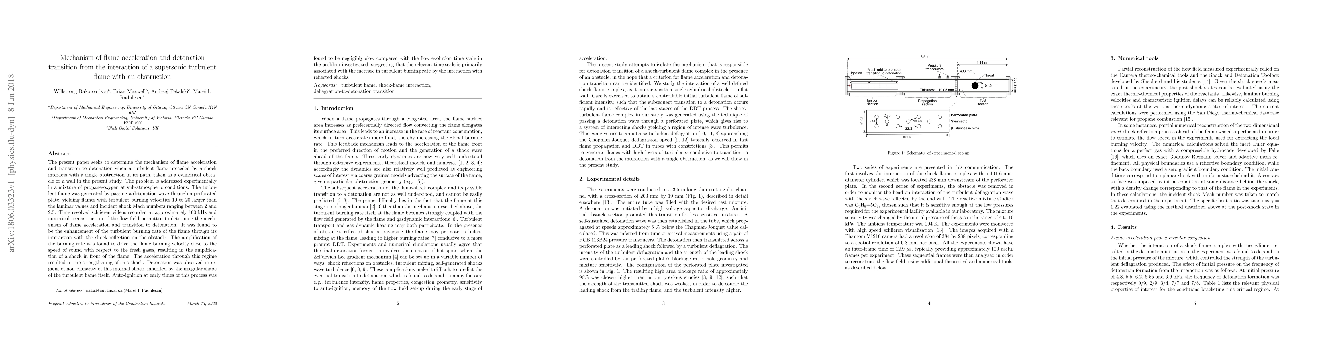 This paper investigates the mechanism of flame acceleration and detonation transition in turbulent flames interacting with obstructions, using propane-oxygen mixtures at sub-atmospheric conditions. The study finds that shock reflection on the obstacle enhances the turbulent burning rate, leading to shock amplification and eventual detonation due to the non-planarity of the flame.